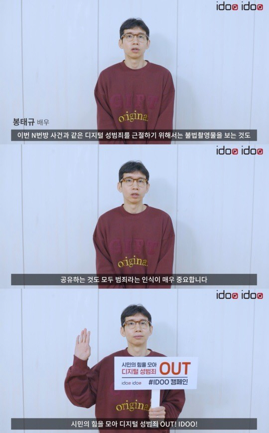 이어 봉태규는 'IDOO 캠페인' 참여를 독려하며 피켓을 들고 디지털 성범죄 예방을 위한 서약을 하며 캠페인을 적극 홍보했다.