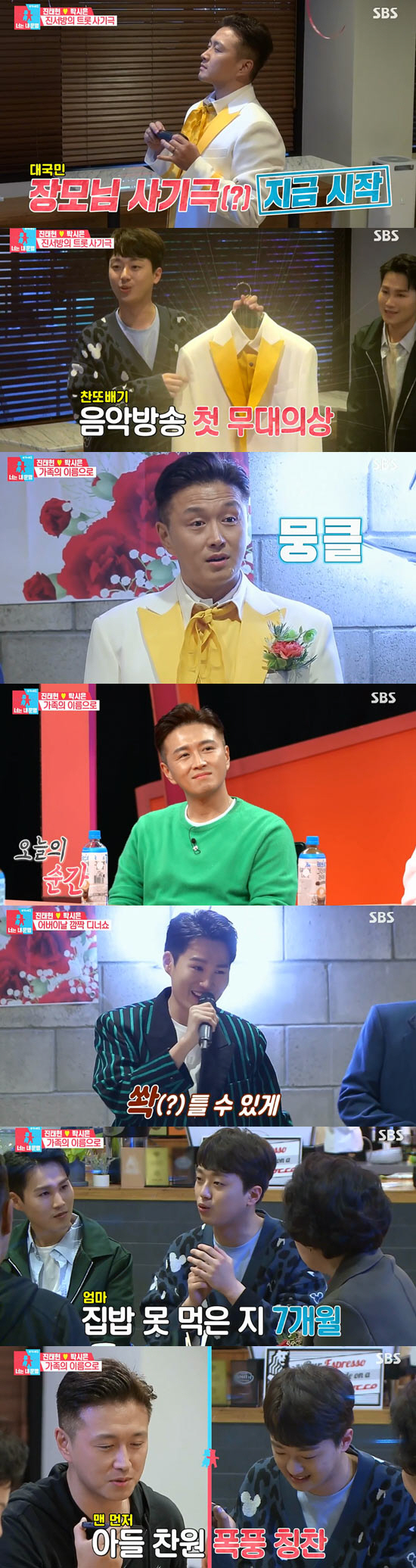 이어진 식사시간. 이찬원은 대구의 어머니에게 연락해 진태현을 바꿔주고 훈훈한 덕담이 오갔다. 특히 이찬원은 "집밥 먹은지 7개월 됐다. 지금 밥이 너무 맛있다"며 인사하자, 진태현은 "우리집에 방이 하나 빈다. 거기 와서 지내라"라고 제안해 웃음을 안겼다.