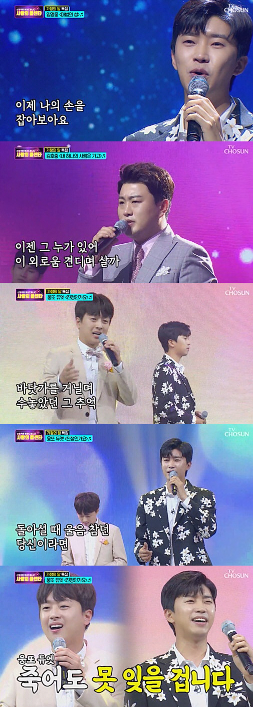 그런가 하면 '사랑의 콜센타' 최초로 듀엣 무대가 펼쳐지기도 했다. 다음 신청자는 어머니의 우울함을 달래드리기 위해 김연자의 명곡 '진정인가요'를 임영웅에게 신청했다. 임영웅은 "꼭 한 번 같이 불러보고 싶었던 멤버가 있다"며 이찬원에게 즉석에서 무대를 제안했고, 두 사람은 '역대급 듀엣 무대'를 탄생시켰다.