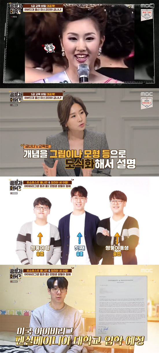 특히 승훈은 공부가 시작되자 흔들림 없는 집중력을 보였다. 그는 "교과서를 자신만의 스타일로 재해석하고, 요점을 정리하는게 가장 효율적인 방법이다"라며 자신만의 공부 비법을 밝혔다. 그러면서 1년 조기 유학으로 한국의 공교육과 해외 교육방식의 차이를 느낀 그는 "영국식 교육방식을 접했는데, 토론하고 활동적인 학습, 교과외에 취미생활 지원이 좋아서 만족스러웠다"고 이야기했다. 이에 금나나는 "질문을 많이 하고 운동을 생활화 한다"라며 하버드생만의 특별한 공부법을 덧붙여 설명했다.
