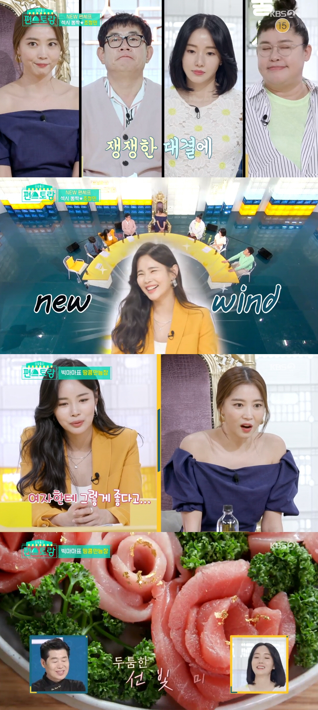 새로운 편셰프의 순서. 조정민은 넓은 거실을 지나 작업실로 들어가보니 트로트디바 조정민이 등장했다. 트로트계 섹시 디바로 활약 중인 중인 조정민은 민낯에도 빛나는 미모로 감탄을 안겼다. 이영자와 오윤아는 조정민의 운동기구에 대해 토론하며 공동구매를 하자고 상의하기도 했다.