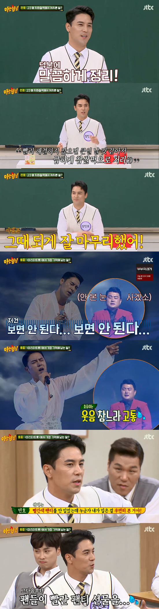 장민호는 과거 고3 때 기상천외한 방법으로 용변 처리를 한 에피소드를 털어놨다가 '아는 형님' 멤버들의 취향을 저격했다.