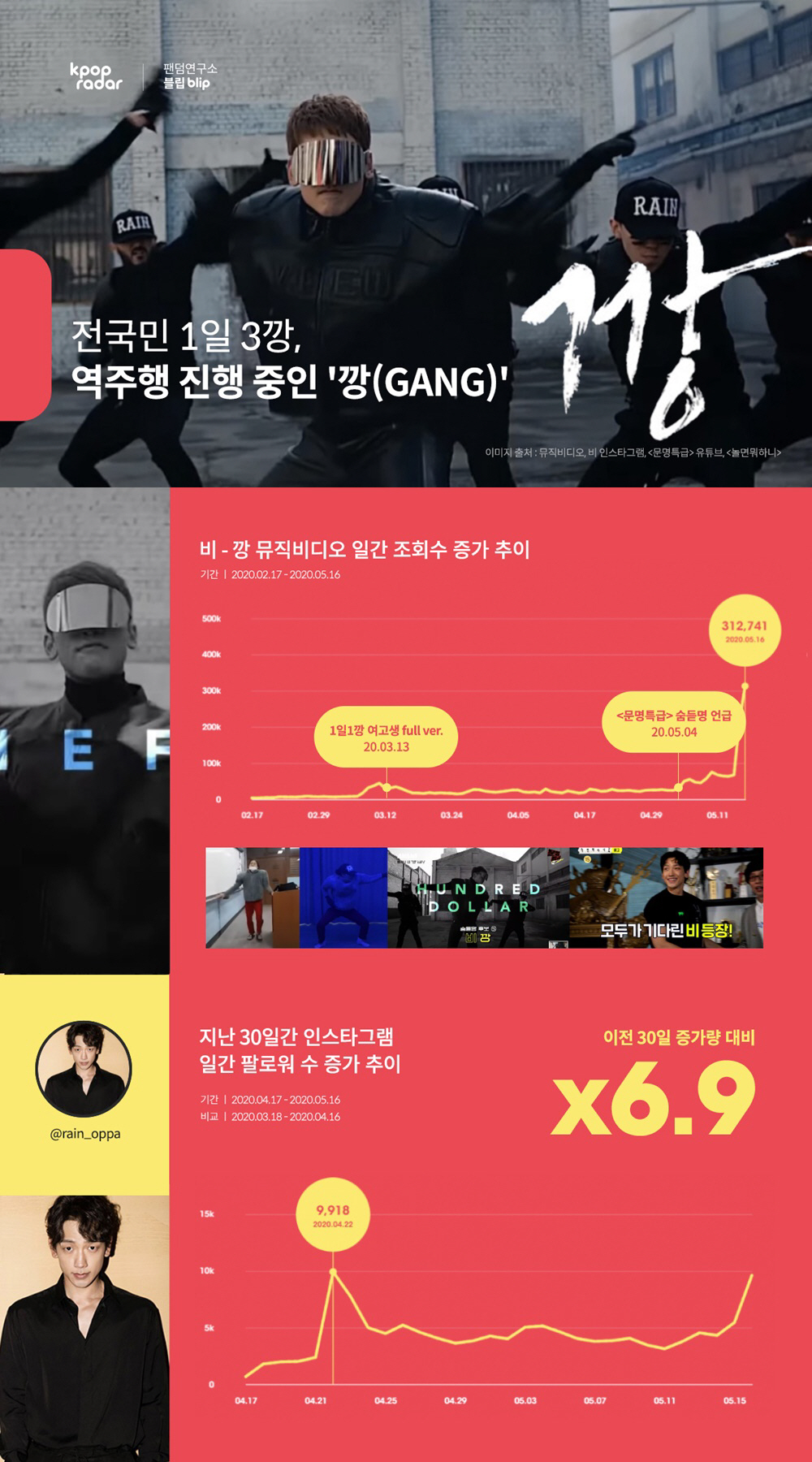 마지막으로 '깡' 열풍과 틱톡 오피셜 계정 오픈 소식은 최근 30일간 비의 개인 인스타그램 팔로워 증가량을 이전 대비 6.9배로 끌어 올리며 인스타그램 팔로워 상승의 견인차 역할도 톡톡히 했다. (비교 : 2020년 03월 18일 ~ 2020년 04월 16일, 30일의 평균 증가량과 2020년 04월 17일 ~ 2020년 05월 16일, 30일의 평균 증가량)