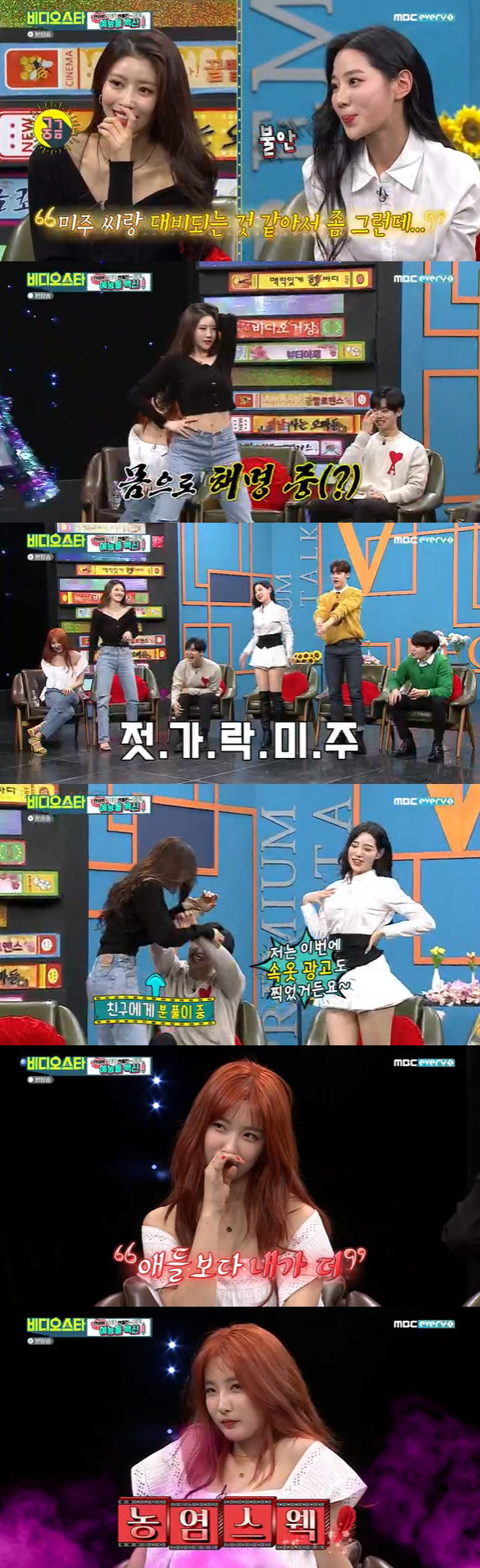 이에 미주는 보란 듯이 앞에 나서서 몸매를 뽐냈고, 조현은 "물론 언니도 (몸매가) 예쁘신데 젓가락 같다. 난 이번에 속옷 광고도 찍었다"고 자랑했다.