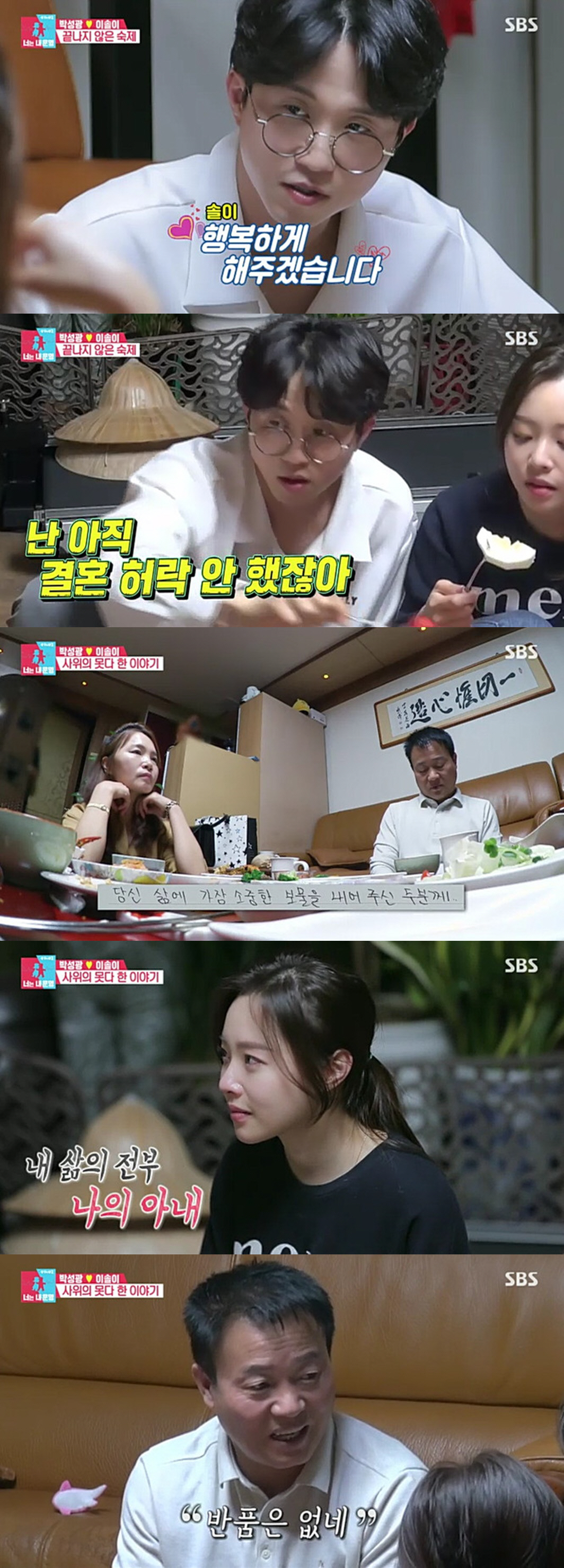 이어 박성광은 장인장모를 위해 쓴 손편지를 읽었다. 박성광은 "당신 삶에 가장 소중한 보물을 내어주신 두 분께"라며 글을 읽었고, 박성광의 편지를 들으며 이솔이는 감동의 눈물을 흘렸다. 편지를 들은 후 장모는 "보물 같은 사위가 들어와서 행복하다"고 했고, "8월 15일(박성광 생일)로 결혼식을 옮긴 게 의미가 크다고 생각한다. 처음엔 혼자 태어났지만, 앞으로 8월 15일은 둘이 태어난다고 생각한다. 우리집 사위가 돼서 행복하고 고맙다"며 박성광을 환영했다. 장인도 "이 말 하면 울 것 같은데, 반품은 없다. A/S 없다"고 말하며 두 사람의 행복을 빌어줬다.
