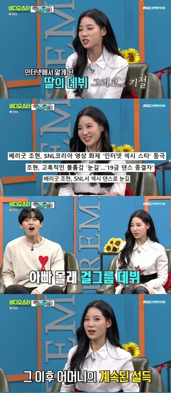 이날 베리굿 조현은 데뷔 4개월 차에 'SNL'에 출연해 섹시한 매력으로 화제를 모은 것에 대해 "하고 싶은 건 해야 하는 성격이라 아빠 몰래 데뷔했다. 실검에 들었던 움짤을 아버지가 보시고 기절하셨다"고 밝혀 모두를 놀라게 했다.