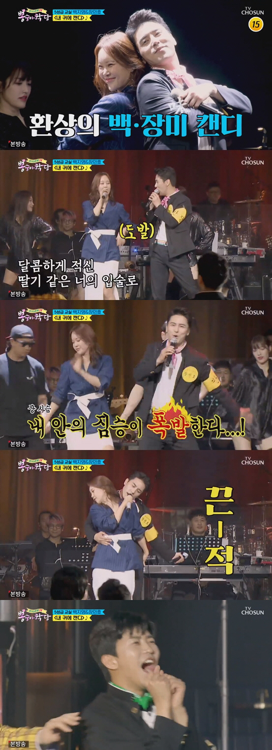 다음으로 백지영은 '내 귀의 캔디'를 불렀고, 미리 댄스 연습까지 해온 장민호가 '캔디맨'을 자처, 숨겨왔던 댄스 실력을 뽐내며 백지영과 '어른 섹시美'가 가득한 성공적인 듀엣 공연으로 현장을 후끈하게 달궜다.