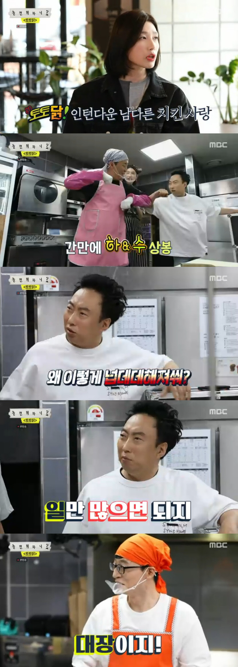 정준하를 본 박명수는 "아무리 급해도 쓸 사람이 따로 있지. 막 부르냐"면서도 정준하와 반갑게 인사했다. 오랜만에 뭉친 '하와수'는 만나자마자 티격댔다. 잡내 없애기용 양파를 본 정준하는 "기름 안에 있는 양파도 먹어도 되는 거 아니냐. 양파 튀김이다"라고 말했고, 박명수는 "방송 되게 못한다. 안 된다는데 왜 그러냐. 입천장 한 번 데여 봐라"라고 답답해해 웃음을 안겼다. 두 사람이 티격태격 대는 사이 시식용 치킨이 완성됐다. 유재석의 후라이드 치킨과 박명수의 양념 치킨을 맛본 김연경과 정준하는 "진짜 맛있다"며 감탄했다.