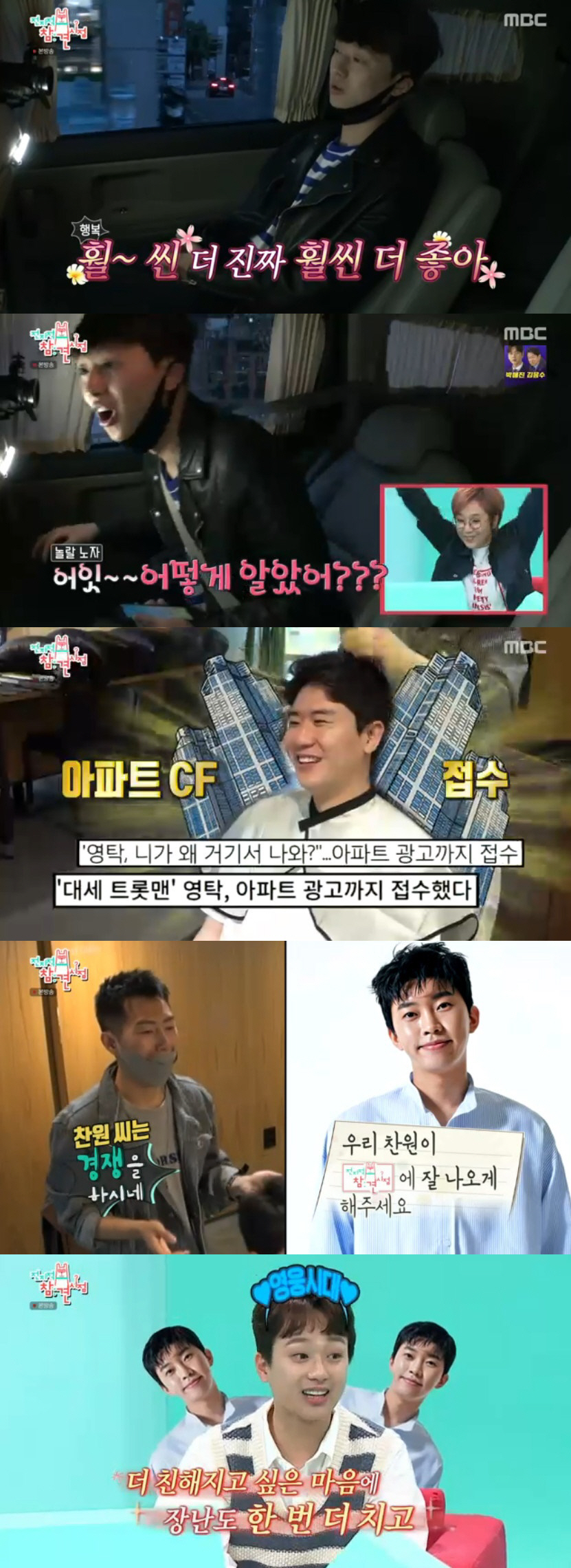 이찬원은 숍에서 영탁을 만났다. 이찬원은 '전참시' 출연에 평소보다 더 흥이 오른 모습이었다. 이에 영탁은 "MBC에서 입금됐냐"고 장난 쳐 웃음을 안겼다. 이어 김희재도 왔다. 세 사람은 이날 라디오 스케줄을 위해 모인 것. 사이 좋은 세 사람은 만나자마자 웃음꽃이 폈고, 이야기 주제는 임영웅 이야기로 흘렀다. 이찬원은 "임영웅은 광고를 몇 개 찍는 거냐"고 장난 섞인 질투를 했고, 이에 스태프는 "임영웅 씨는 찬원 씨 잘 부탁 드린다고 했는데 찬원 씨는 질투한다"고 말해 이찬원을 당황하게 했다. 이찬원의 질투는 팬심에서 우러나온 거였다. 이찬원은 (임영웅) "형처럼 되고 싶어서 장난으로 질투도 하는데 임영웅 최근 광고를 많이 찍어서 진짜 견제도 한다"고 말해 웃음을 안겼다.