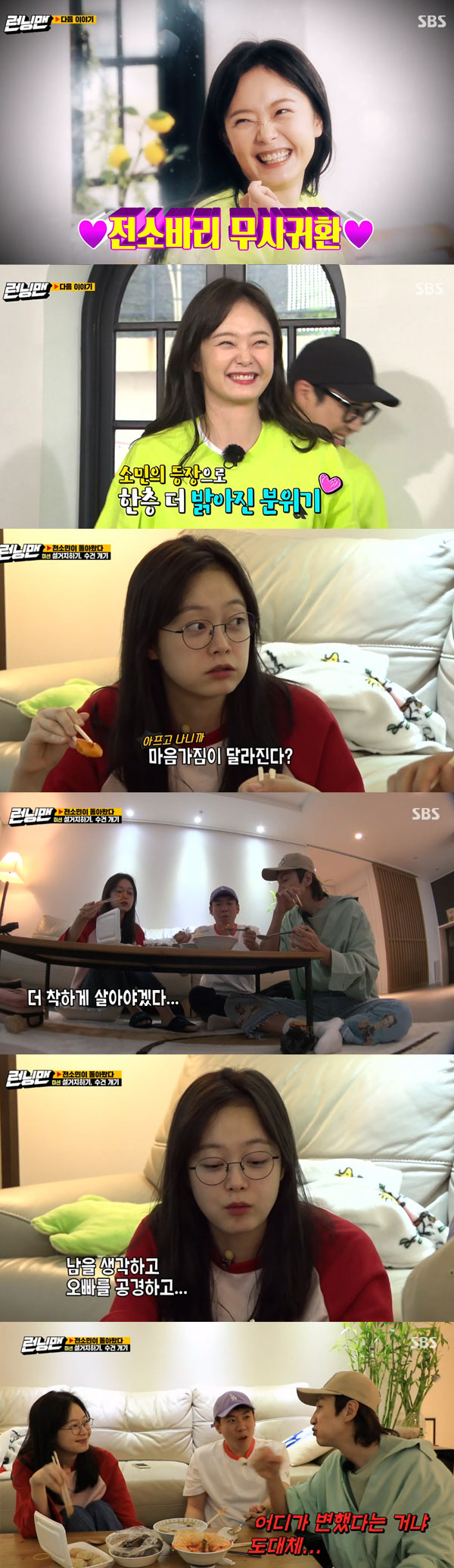 전소민은 지난 3월 '런닝맨' 촬영 도중 컨디션 이상으로 병원을 찾았다가 휴식이 필요하다는 의료진의 소견을 듣고 잠시 활동을 중단한 상태다. 이러한 가운데 24일 방송된 SBS '런닝맨'을 통해 오랜만에 반가운 근황을 전했다. 오는 31일 방송부터 복귀하는 전소민은 이날 자신의 집을 찾은 이광수와 양세찬에게 "아프고 나니 마음가짐이 달라졌다. 더 착하게 살아야겠다고 생각했다"며 "남을 생각하고 오빠를 공경하고"라면서도 바로 두 사람에게 버럭해 웃음을 안겼다.