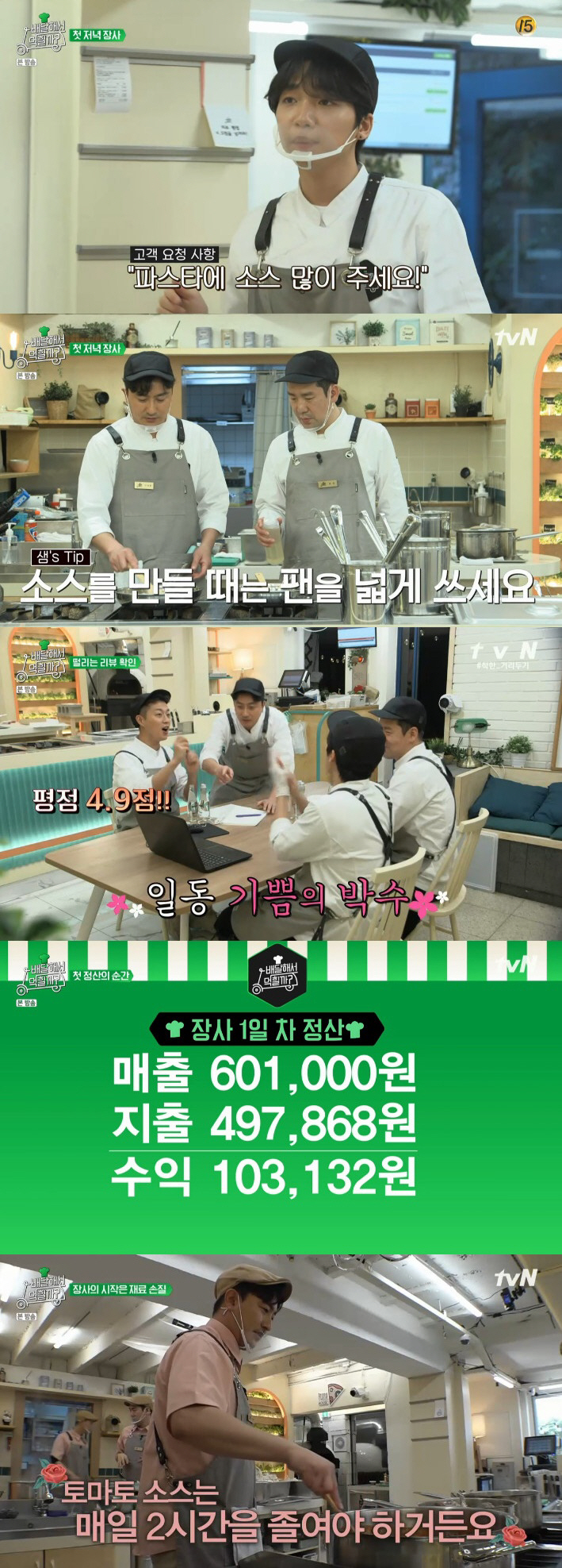 첫날 영업을 마친 후 멤버들은 한 자리에 모여 리뷰와 매출을 확인했다. 이날의 주문 수는 23건이었고 그 중 리뷰는 10개였다. 평점은 먹퀘스트 점수였던 4.5을 훌쩍 넘은 4.9점. 손님들은 안정환의 피클부터 정세운의 추천 BGM까지 모두 호평했다. 다만 샘킴의 펜네가 딱딱하게 느껴졌다는 아쉬운 리뷰도 있었다.