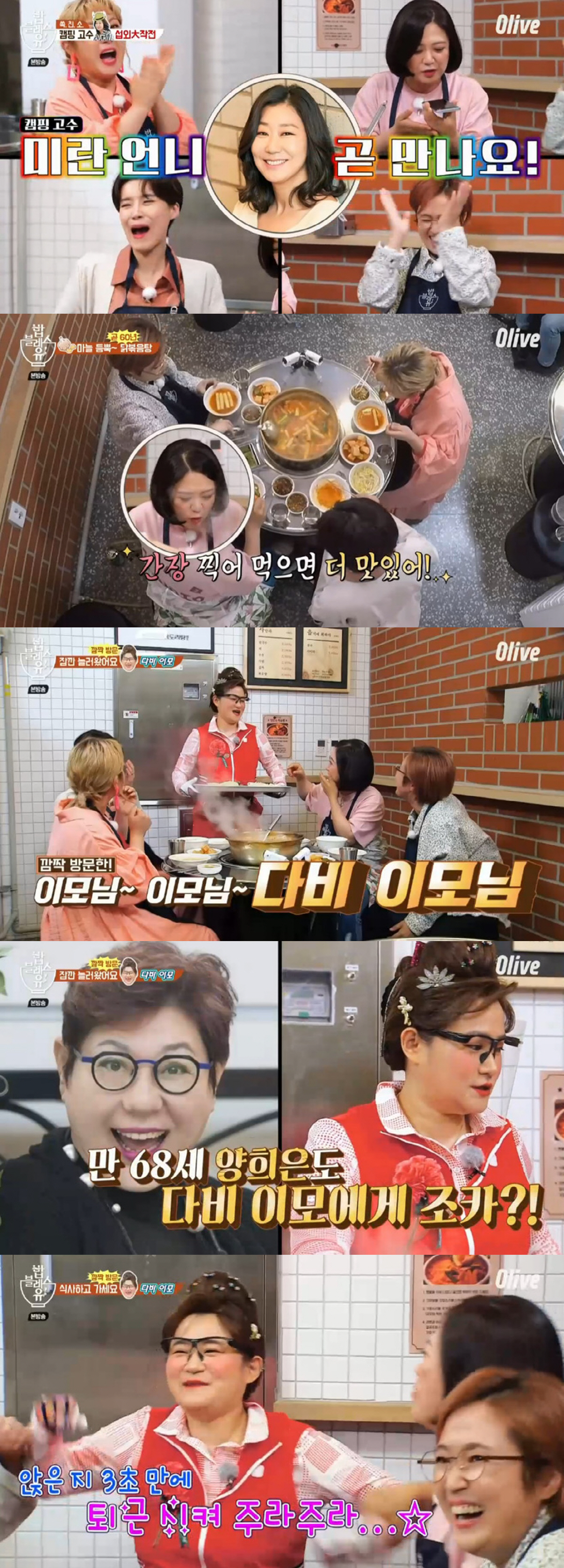 닭볶음탕을 기다리며 라미란 이야기가 나왔다. 김숙은 '캠핑 고수' 라미란에게 즉석에서 전화를 걸었고, 멤버들은 라미란 섭외 작전에 돌입했다. 라미란은 "저야 뭐 시간이 남아 돈다"고 흔쾌히 답했고, 이에 김숙은 "은이 언니가 좋은 침낭 갖고 올 것"이라고 부추겼다. 라미란은 "제가 리스트 작성에서 보내겠다"고 받아쳐 웃음을 안겼다.