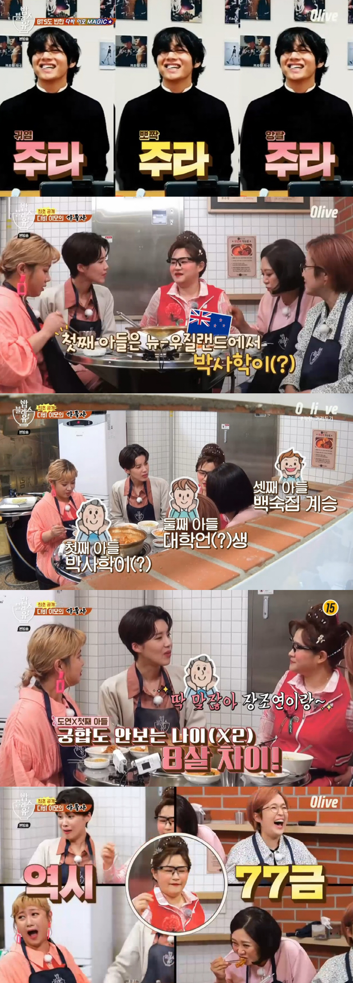 이어 김다비는 "얼굴만 보고 결혼하지마라. 나는 얼굴만 보고 결혼했다"며 남편 이야기를 꺼냈다. 남편에 대해 "성격이 순하다. 성질 내도 허허 웃는다"는 김다비는 이어 '19금'을 넘은 '77금' 입담으로 멤버들을 또 한 번 웃겼다. 김다비 이모가 가고 싶은 소속사는 방탄소년단이 속한 빅히트 엔터테인먼트라고. 김다비는 "내 음악 성향은 빅히트다. 에이트 노래도 좋아했다"며 '심장이 없어'를 즉석에서 불렀다. 이어 "송은이 조카 사옥을 좋은 곳으로 옮기고 싶다"고 송은이를 향한 마음을 고백했다.