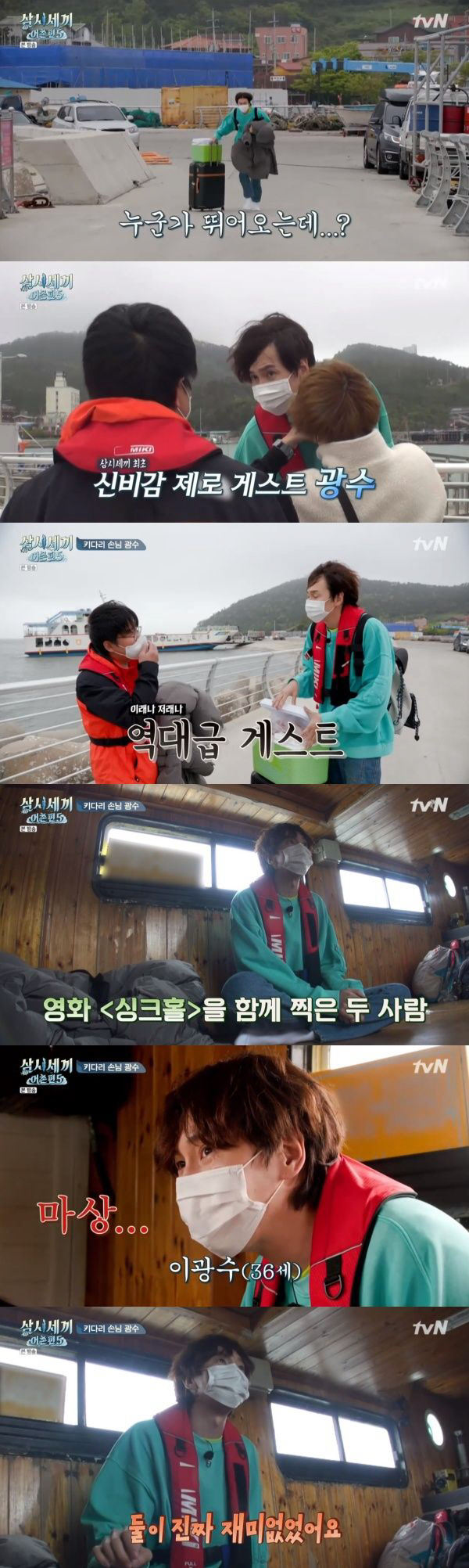 이광수는 삼시세끼의 세 사람과 각각 다른 루트의 친분을 갖고 있다고 했다. 그는 "차승원 형님과는 최근에 영화 '싱크홀'을 같이 찍으면서 가까워졌다. 유해진 선배님과는 '런닝맨'에서 만났다"고 설명했다. 또 손호준에 대해서는 "저보다 한살 형이다. 호준이 형이 술 한 번 같이 마시자고 연락을 줬다. 둘이 있으면 진짜 재미없다. 말도 거의 안했다. 그래도 몇번 더 만났다"고 말해 웃음을 유발했다.