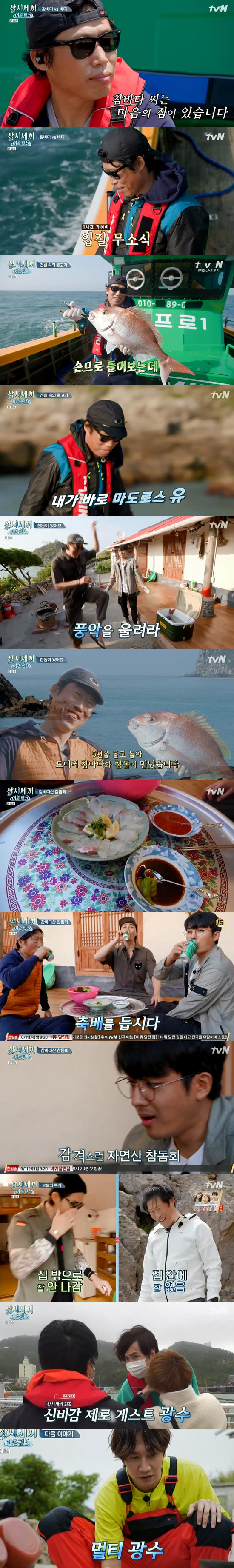 위풍당당하게 차승원 손호준 앞에 참돔을 내놓은 유해진은 무용담을 거창하게 풀어냈다. 차승원은 거대한 참돔을 능숙하게 해체하고 회를 만들어 소담스러운 회 한상을 뚝딱 만들어냈다. 세 사람은 모처럼 풍족한 밤, 배우로서의 색깔과 고집, 무색 무취에 대한 서로의 고민을 털어놓으며 "그런 것을 알고 노력해나가는 것이 중요하다"고 서로를 토닥였다.