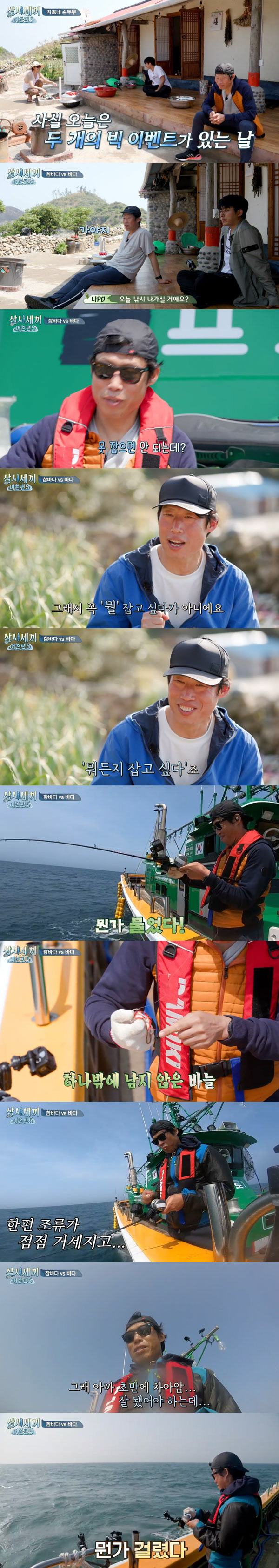 유해진은 참돔을 아이스박스에 담아 돌아왔고, 멀리서부터 느껴지는 큰 기운에 손호준은 뛰어나와 그를 반겼다.