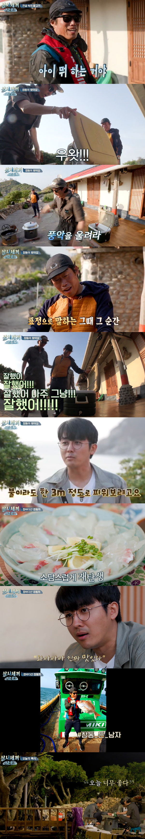 '마도로스유' 유해진의 손에 잡힌 참돔은 '차셰프' 차승원의 손으로 옮겨져 맛과 멋이 풍부한 한 접시의 고급 요리로 탄생했다. "오늘 너무 좋다"면서 차승원, 유해진, 손호준은 특식으로 라면을 먹으며 행복한 하루를 마무리했다. 한 편의 드라마 같은 감동과 재미를 모두 잡은 한 회였다.