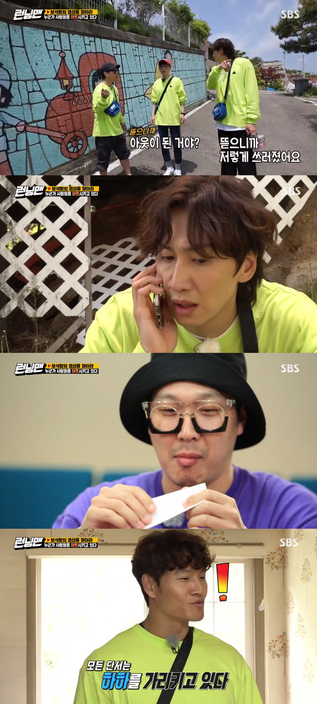 그사이 양세찬과 이광수는 '범인은 힘이 세고 빠르다'는 힌트를 바탕으로 범인이 김종국이라 추리했다. 또 보석함을 찾은 사람은 모두 사라졌다는 기사 역시 발견했다. 옆 마당으로 향한 두 사람은 허수하비로부터 공격을 받았다. 순식간에 광수가 아웃당하고 제물로 희생이 됐다.