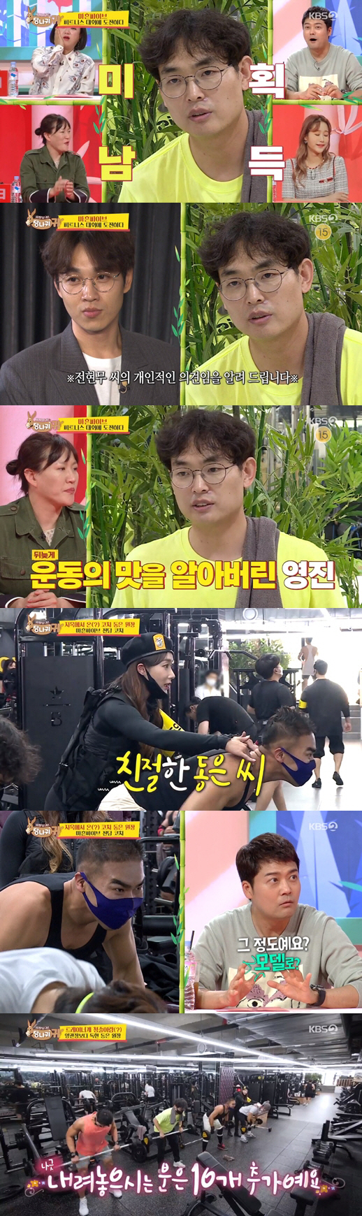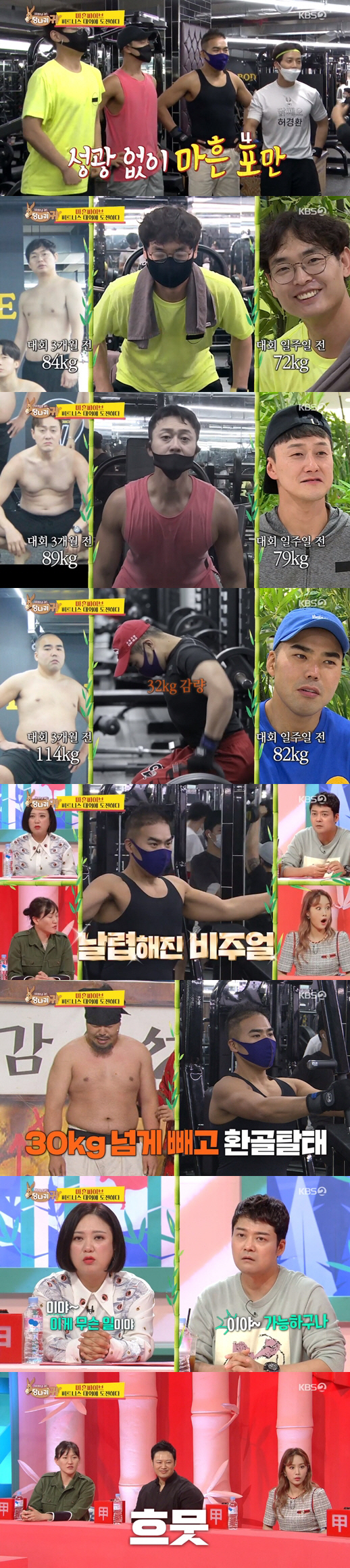 31일 방송된 KBS 2TV 예능 '사장님 귀는 당나귀 귀'에서는 근육 저승사자 양치승과의 특훈을 통해 몰라보게 달라진 '마흔파이브'의 허경환, 박영진, 김원효, 김지호 4인의 환골탈태 근황이 공개됐다.