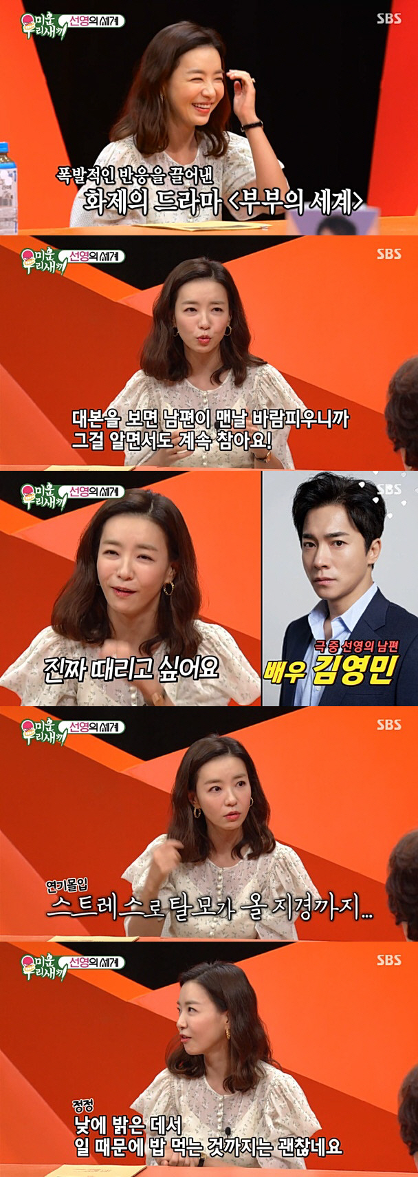 박선영은 "자기 경험을 증폭시켜서 연기를 한다. 근데 대본을 보면 남편이 맨날 바람 피우는데 그걸 알면서도 참는다. 그걸 표현해야 되는데 보면 너무 화가 나서 스트레스 받는다. 상대 배우 오빠를 보면 정말 때리고 싶다, 스트레스로 탈모까지 왔다"고 털어놨다.