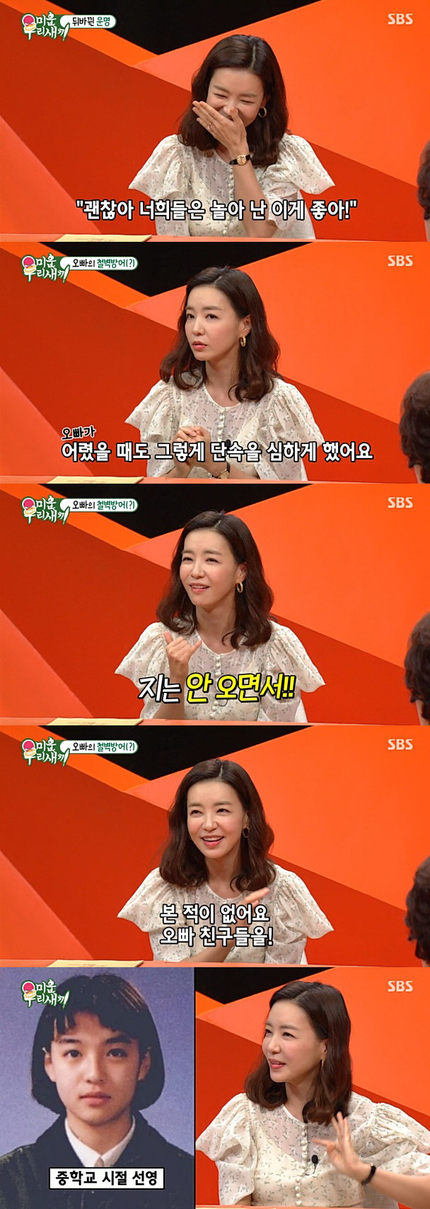 어렸을 때부터 뛰어났던 외모 탓에 박선영은 친오빠의 단속을 받아왔다. 박선영은 친오빠에 대해"오빠랑 한 살 차인데 되게 어른인 척 한다. 오빠가 되게 단속을 해서 어렸을 때 반바지를 입어본 적이 없다. 통금까지 있었다"며 "오빠 친구들을 집에 데려오지도 않았고 데려오더라도 저를 방 안에 들어가게 했다. 얼굴을 한 번도 본 적 없다"고 밝혔다. 이어 박선영의 중학교시절 사진이 공개됐다. 뚜렷한 이목구비와 앳된 미모에 모벤져스는 "(오빠가) 단속할 만 하다"라고 감탄했다.