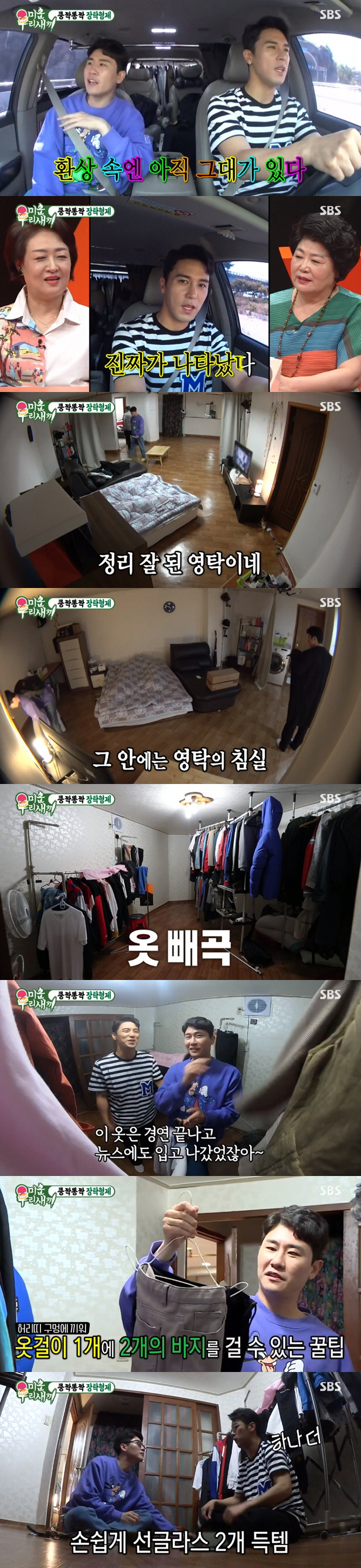 도착한 영탁 하우스는 깔끔했다. 특히 옷걸이에는 장민호가 선물해준 옷이 가득했다. 지난 주 방송에서도 집에 놀러온 영탁에게 옷을 선물했던 장민호의 모습이 담긴 바 있다. 영탁은 장민호에게 선글라스를 선물하며 그동안 받은 옷선물에 대한 감사를 전했다.