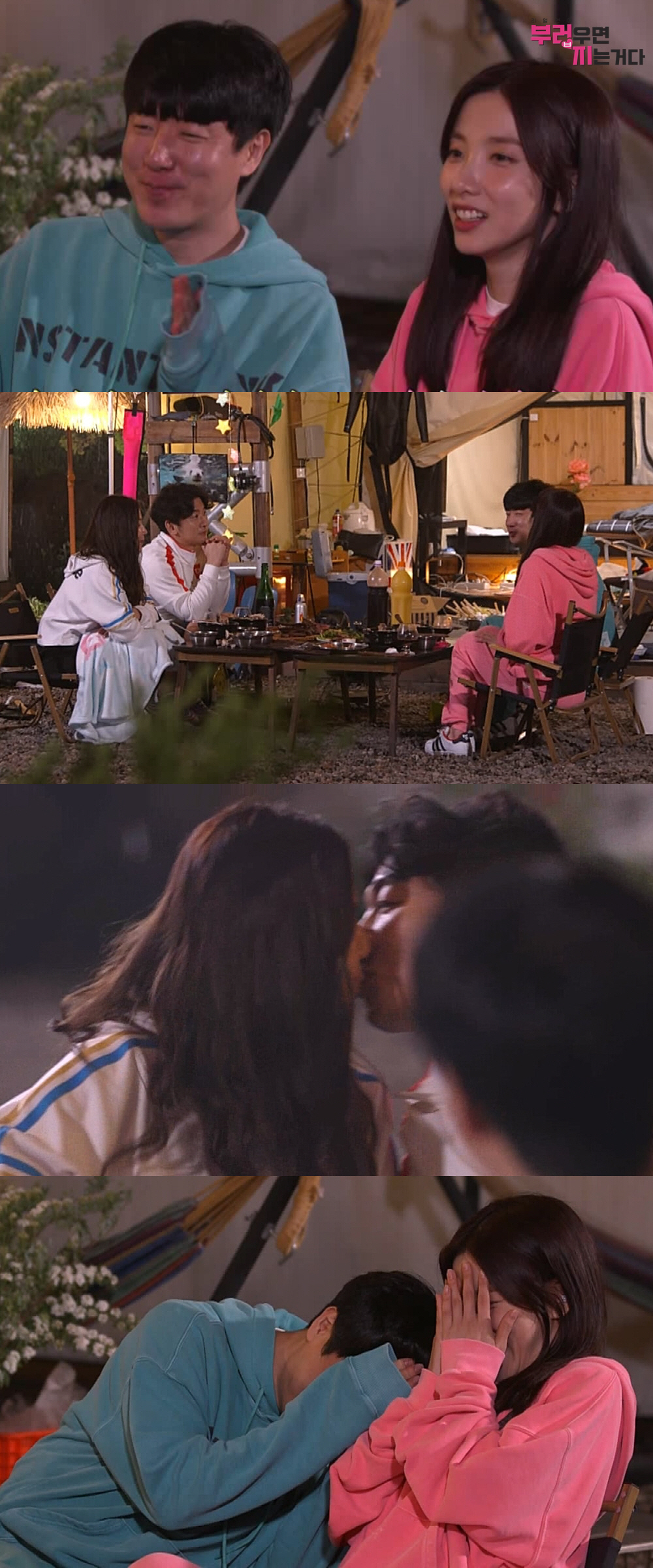 [스포츠조선닷컴 김준석 기자] MBC '부러우면 지는거다' 최송현-이재한 커플이 과감한 입술 뽀뽀로 '두더지 커플' 지숙-이두희를 도발한 현장이 포착됐다. 스페셜한 글램핑 저녁 만찬 후 후끈해진 분위기에 벌어진 돌발 상황 후엔 과연 어떤 일이 벌어질지 이목을 집중시킨다.