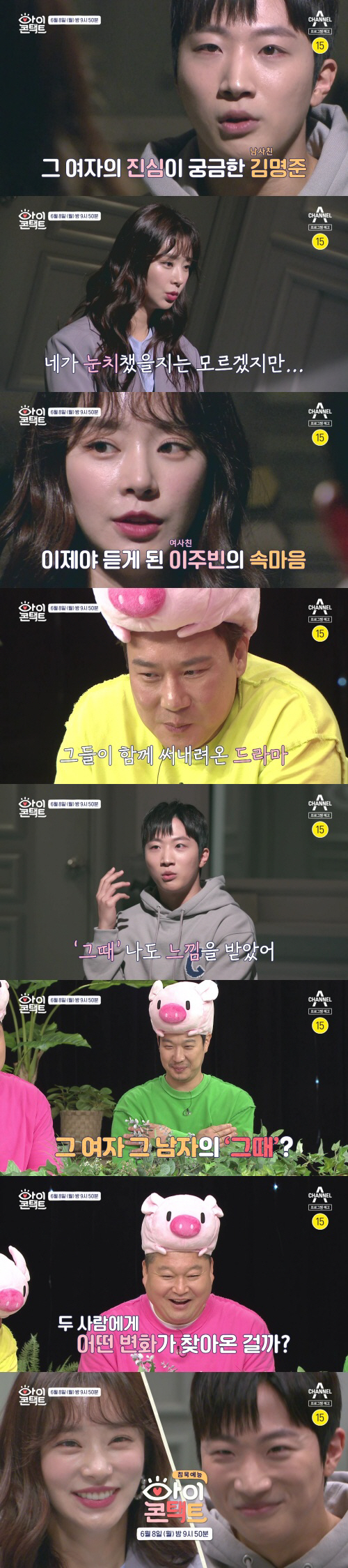 처음에는 눈이 마주치자마자 웃기만 하던 이주빈은 "네가 알고 느꼈을지는 모르겠는데, 작품 중간에 사실..."이라며 입을 열었다. 이에 김명준 역시 "그 때 나도 약간 느낌을 받았어. '이게 무슨 일이지?'라고도 생각했고..."라고 답해, 이들이 말하는 '그 때' 무슨 일이 있었는지에 대한 궁금증을 자아냈다.