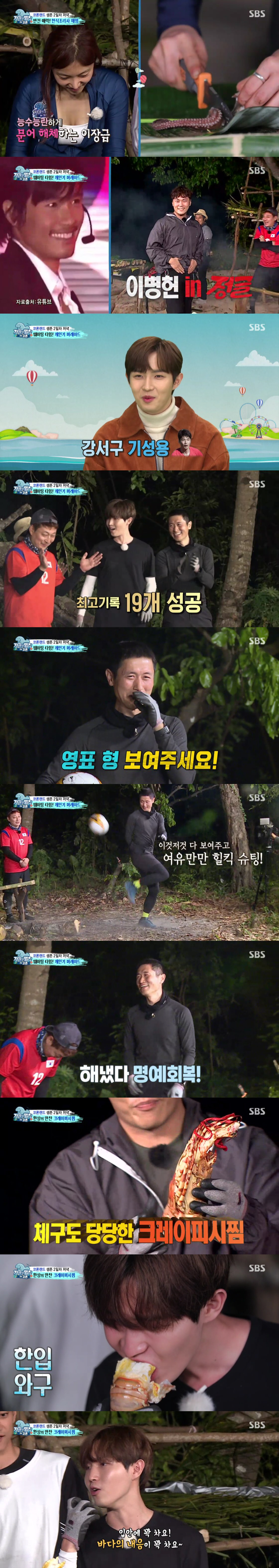 찜이 진행되는 동안 송진우와 이채영은 갑자기 홈쇼핑 쇼호스트 개인기로 경쟁이 붙어 눈길을 끌었다. 특히, 송진우는 이병헌 개인기는 물론, 난타 공연까지 본인의 온갖 개인기를 풀어놓았다. 이에 질세라 전 국가대표 축구 선수인 이영표, 축구 선수 출신의 노우진, 자칭 강서구 기성용 김재환, 여기에 김병만 족장까지 축구를 사랑하는 부족원들이 축구 리프팅 개인기에 도전했다.