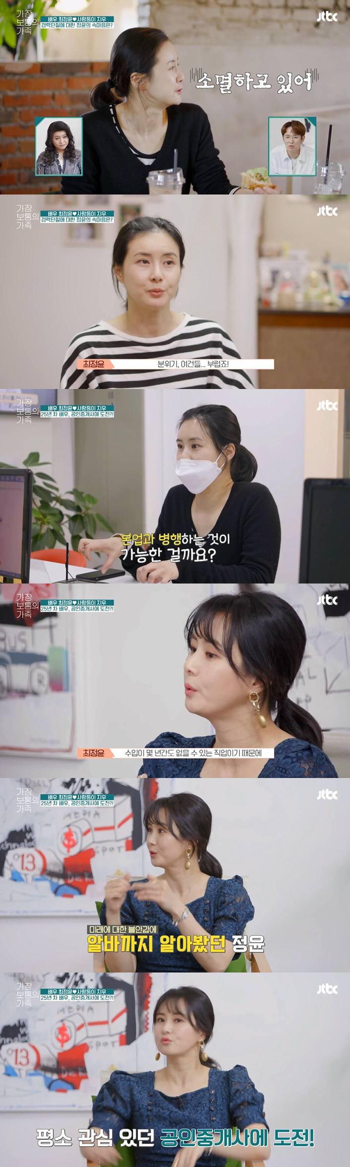 최정윤은 "사실 이 직업이 어떻게 될지도 모르고 벌 땐 벌지만 아닐 때는 수입이 몇 년간 없을 수도 있는 직업이기 때문에 혼자였으면 별 고민 안 했을 텐데 지우가 있으니까 가만히 있으면 안되겠구나라는 생각이 들었다"며 "아르바이트까지 알아봤는데 나이가 걸렸다. 그렇게 알아보다가 공인중개사까지 알아보게 됐다"며 새로운 분야에 대한 도전을 결심한 이유를 밝혔다. 이를 들은 한고은도 40대 여배우로서의 현실에 공감했다.