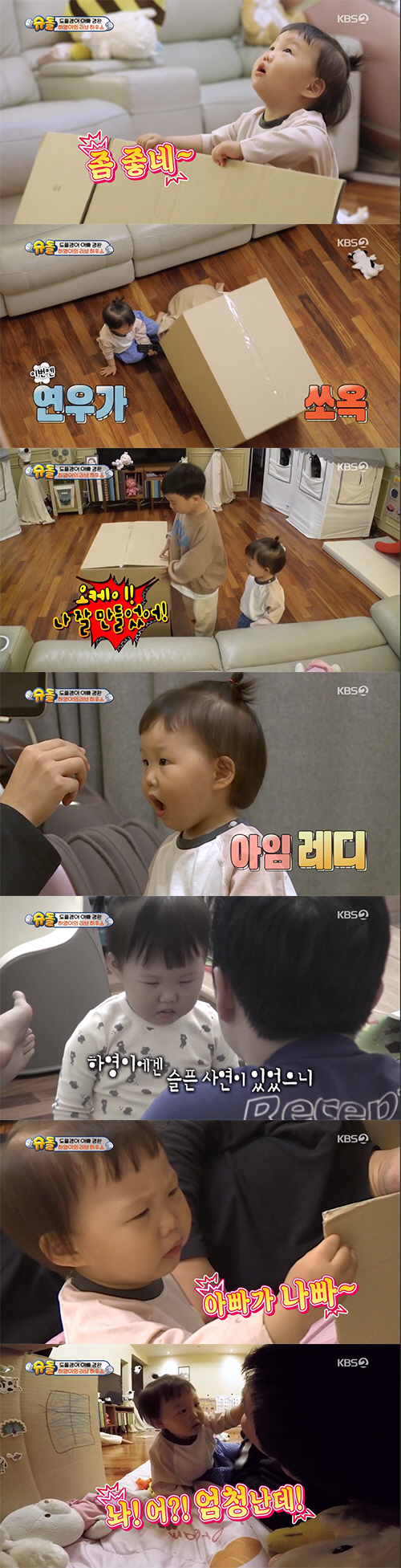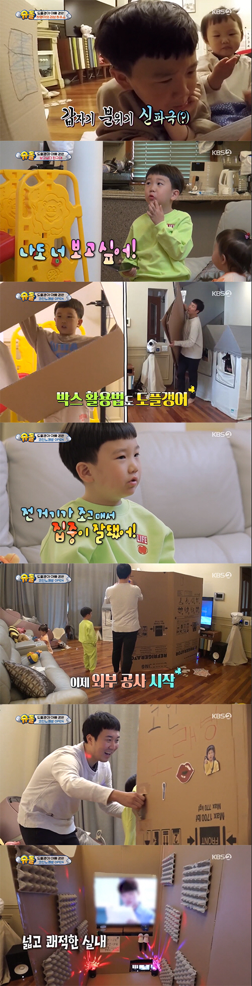 하지만 그동안 '슈돌'에 등장했던 집들과는 조금 다른 비주얼을 자랑해 웃음을 자아냈다. 이때 연우는 하영이를 위해 이불을 깔아주고 박스에 그림까지 그려 넣는 모습을 보였다.