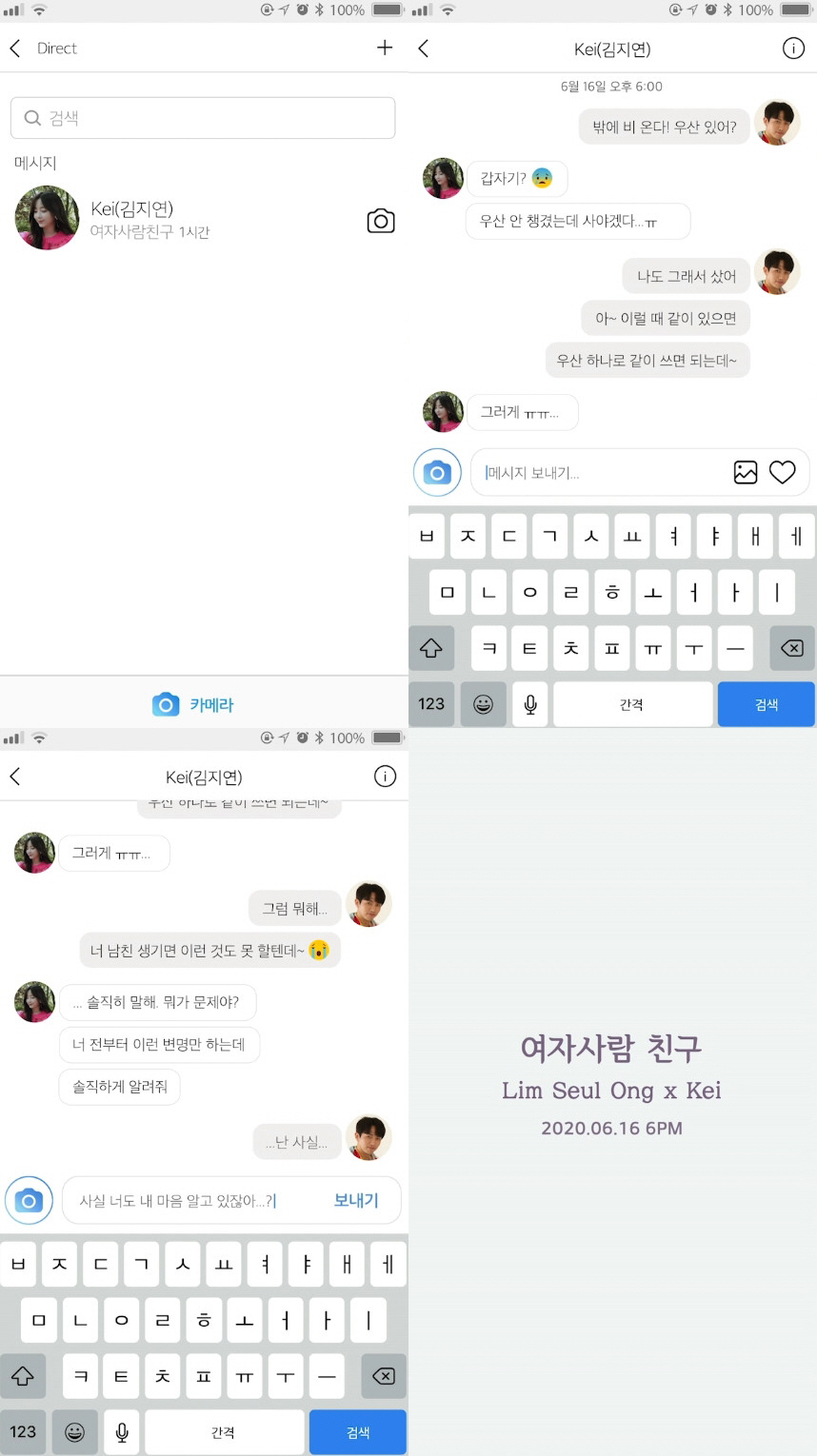 먼저 "밖에 비 온다! 우산 있어?"라고 대화를 시작한 임슬옹이 "이럴 때 같이 있으면 우산 하나로 같이 쓰면 되는데", "그럼 뭐해, 너 남친 생기면 이런 것도 못 할 텐데" 등 복잡하고 미묘한 마음을 드러낸다. 이에 케이는 "솔직히 말해 뭐가 문제야?"라고 되묻고, 고민하던 임슬옹이 "사실 너도 내 마음 알고 있잖아?"라고 메시지를 쓰는 모습으로 영상이 마무리되며, 두 사람의 이야기가 어떻게 이어질지 호기심을 불러일으켰다.