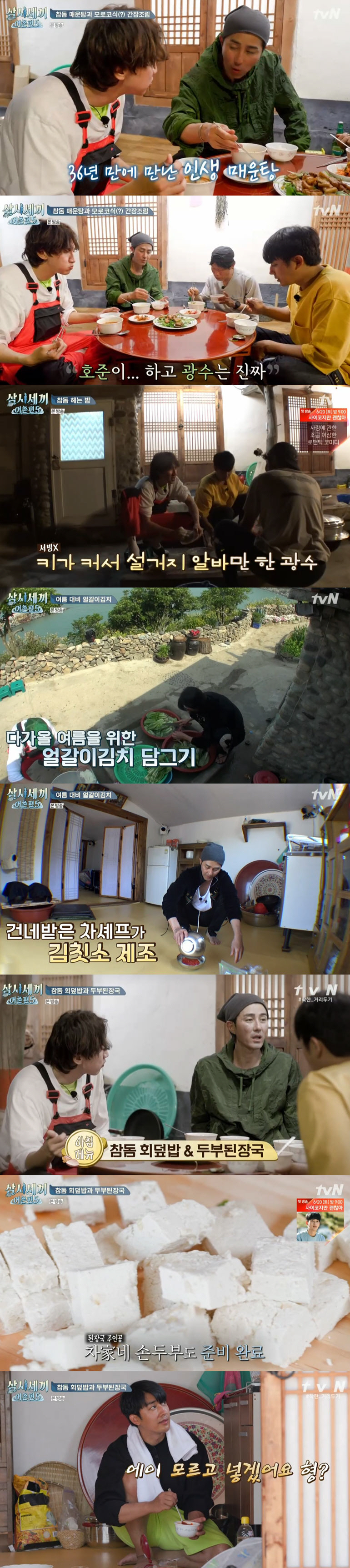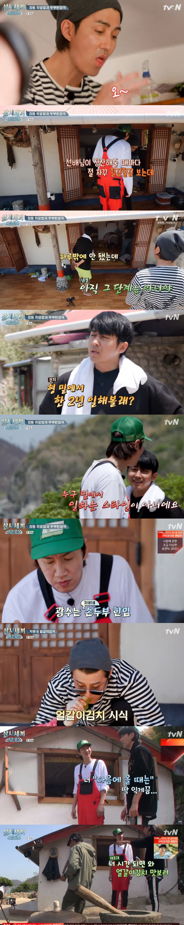 식사 후 차승원은 얼갈이 김치를 마무리했다. 이때 차승원은 이광수에게 "너 다음에 올때는 딱 익게끔, 시간되면 얼갈이 김치 맛보러 와라"고 재초대했다. 이광수는 "오랫동안 기억에 남을 것 같아 행복했다"며 소감을 전했다.