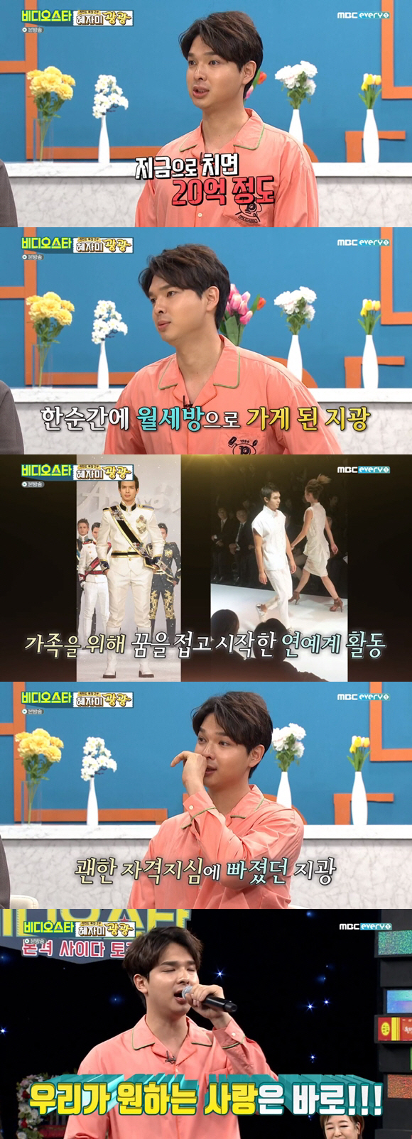 류지광은 과거 고생담을 고백하며 눈물까지 보였다. 류지광은 "원래는 연예계 일을 원하지 않았다. 운동을 좋아해서 운동 쪽 일을 하고 싶었는데, 어머니가 보증을 잘못 서서 지금으로 치면 20억원 정도 빚을 졌다. 초등학교 때였는데 한 순간에 월세방으로 가게 됐다"고 어린시절을 회상했다.