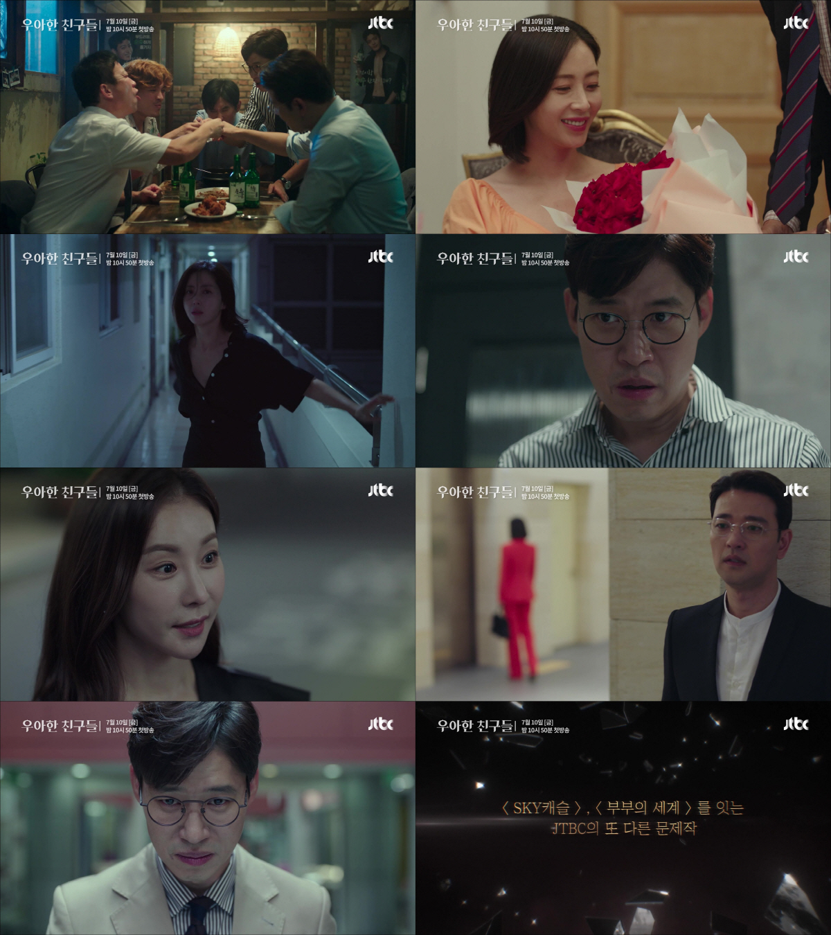 '우아한 친구들'을 향한 반응이 예사롭지 않다. 강렬하고 파격적인 티저와 포스터가 베일을 벗으며 뜨거운 관심이 쏠리고 있는 것. 신드롬을 일으킨 'SKY 캐슬'과 '부부의 세계'를 잇는 JTBC의 또 다른 문제작이자, 기대작으로 손꼽히며 기다림마저 설레게 만든다. 무엇보다 장르를 불문하고 '올라운더'로 활약 중인 유준상과 2년 만에 드라마로 돌아오는 '믿보배' 송윤아, 새로운 인생 캐릭터 도전에 나선 배수빈과 대체 불가한 매력의 한다감 등 이름만으로 신뢰를 더하는 배우들의 존재감이 기대심리를 자극한다.