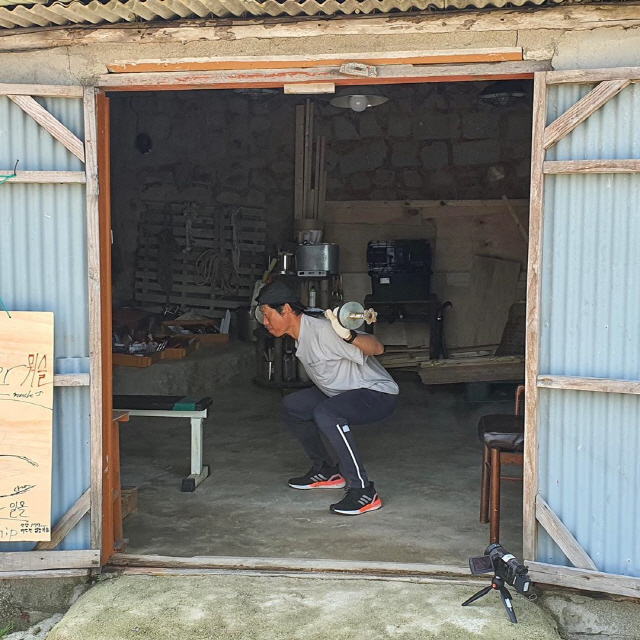 사진에는 '아뜰리에 뭐슬'표 운동기구로 운동을 하는 유해진의 모습이 담겨 있다. 진지한 표정으로 운동에 집중하는 유해진의 모습이 눈길을 끈다.
