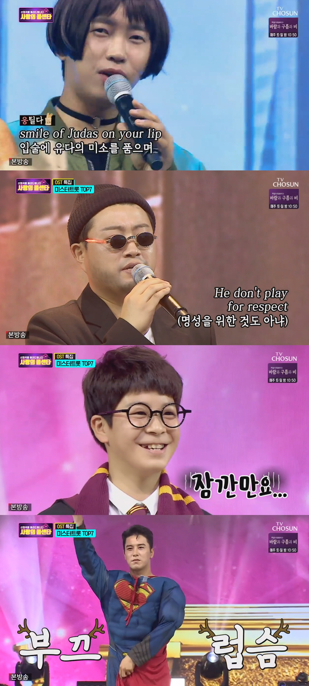 mc 김성주는 '사콜예술대상'을 소개하며 TOP7을 불러냈다. 첫 번째 후보는 영화 '웰컴투동막골' 분장을 한 이찬원. 그는 즉석에서 연기를 선보여 박수를 받았다. 두 번째는 람보로 분한 영탁이었다. 영탁은 시작부터 총을 연발하며 강렬한 인상을 남겼다. 최연소 후보 '해리뽀짝' 정동원은 마법 주문을 잊어버려 웃음을 자아냈다. '찰리 재플린' 김희재는 완벽한 탭댄스로 감탄을 안겼다. 한국판 슈퍼맨 '녹용맨' 장민호는 부끄러워하면서도 멋진 포즈를 선보였다.