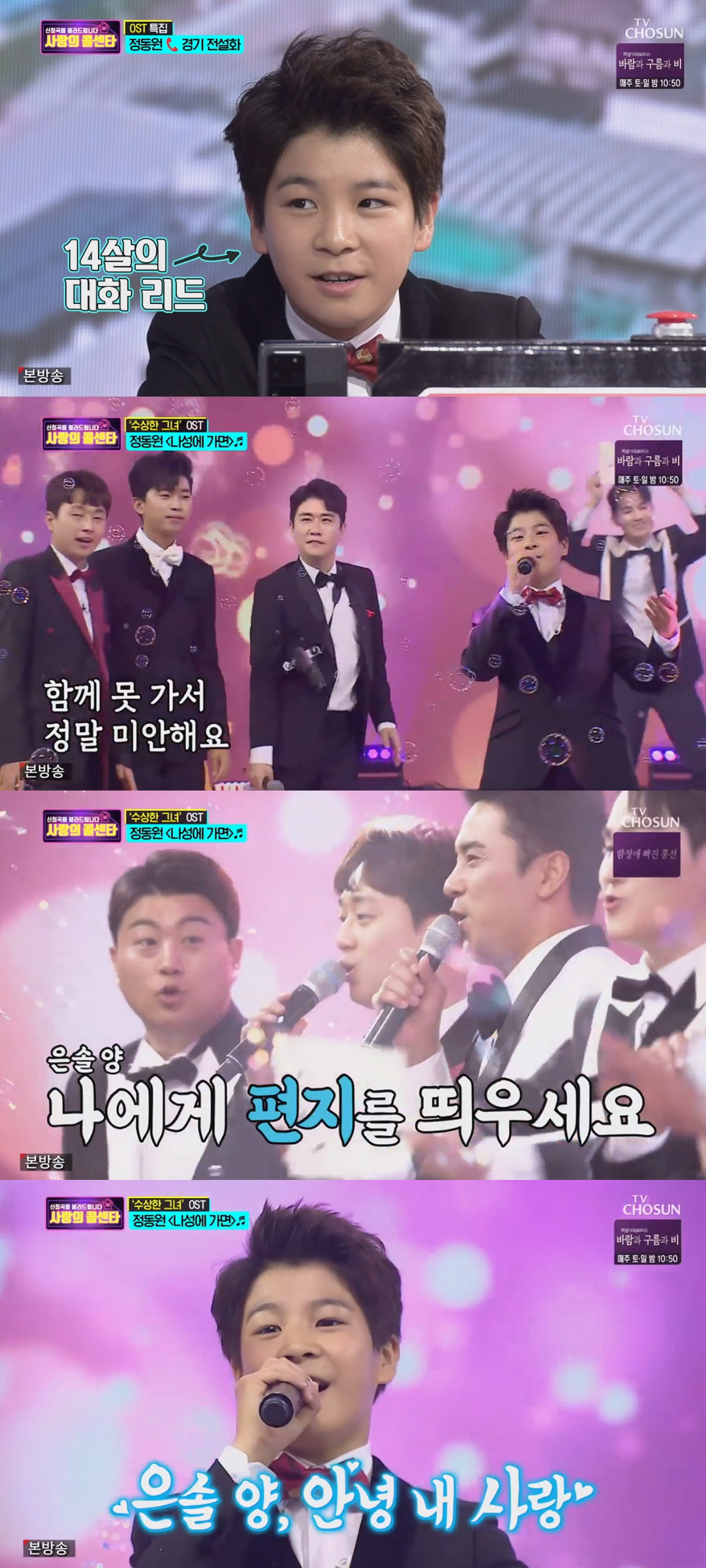 즉석에서 정동원과 딸의 통화가 진행됐다. 딸과 정동원은 알콩달콩 달달한 통화로 설렘을 안겼다. 딸의 꿈은 헤어디자이너라고. 정동원의 예전 꿈도 헤어디자이너였다. 정동원은 "나중에 내 머리도 한 번 해줘"라고 부탁했다. 신청곡은 '나성에 가면'. 딸은 "정동원 오빠가 부르는 거면 다 좋다"고 말해 삼촌들을 심쿵하게 했다. 정동원은 모녀의 응원에 힘 입어 감미로운 노래를 전했다.