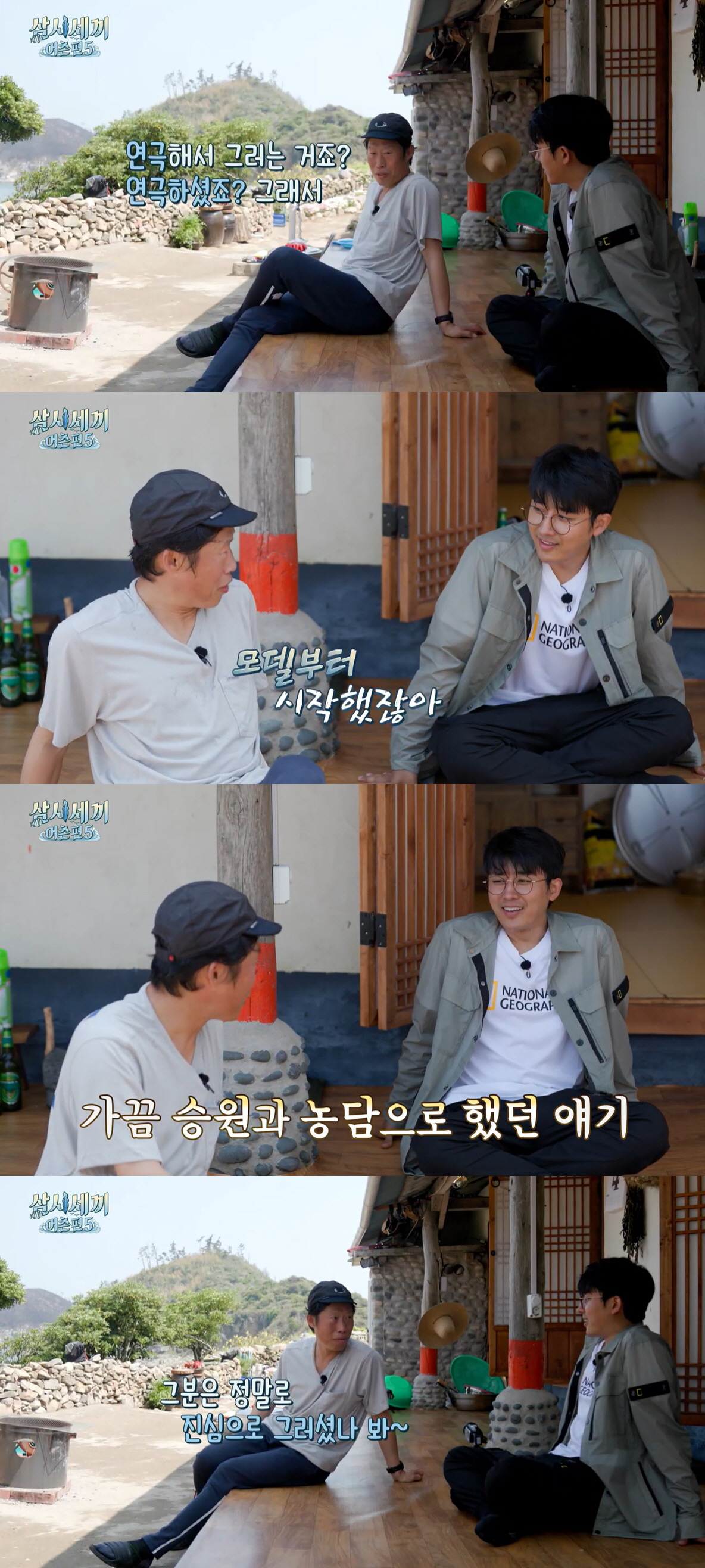 유해진은 "내가 등산 갔는데 아저씨 두 분이서 되게 반갑게 인사를 하시더라. 그래서 같이 인사했는데 '(방송에서) 뚝딱뚝딱 만들고 그러는 게 다 연극해서 그러는 거죠?'라고 하셔서 '네'라고 했더니 옆에 아저씨가 '무슨 소리냐. 모델부터 시작했다'라고 하셨다"고 말해 폭소케 했다. 이어 "내가 차선수랑 농담으로 (모델) 얘기한 걸 그분은 진심으로 들으셨나 보더라. 한참 웃었다"고 덧붙였다.