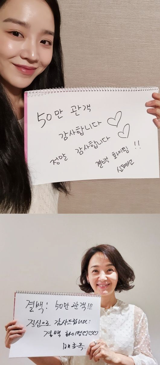 이에 주연을 맡은 신혜선과 배종옥은 관객들에게 감사 인사를 전했다. 신혜선은 "50만 관객 감사합니다♡ 정말 감사합니다♡ '결백' 파이팅"이라고 했고, 배종옥도 "'결백' 50만 관객!!! 진심으로 감사드립니다! '결백' 파이팅♡♡♡"이라고 손편지까지 보내 진심 어린 감사를 표했다.