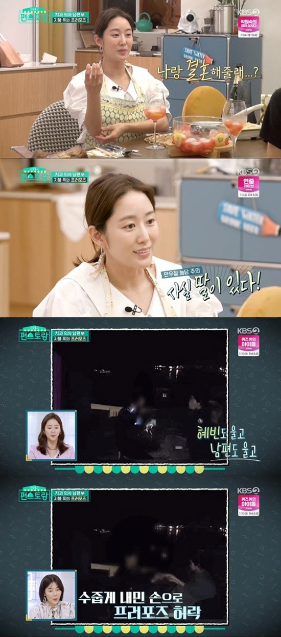 전혜빈은 프러포즈 영상을 최초로 공개했다. 전혜빈은 "한 달 동안 남편과 여행을 가게 됐다. 숙소의 빨간 지붕에서 와인을 마시는데 갑자기 프로젝터를 하나 가져오더라. 내 친한 친구한테서 다 인터뷰를 따온 거다. 그러다가 결혼해달라며 반지를 건네더라. 펑펑 울면서 '결혼할게요'라고 했다. 뻔한데 되게 감동적이었다. 여기까지는 일반 프러포즈다"고 말해 기대감을 높였다.