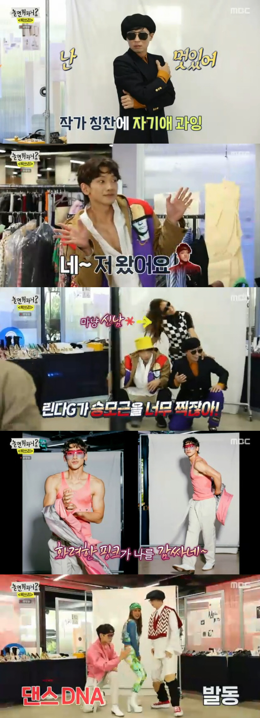 다음 의상은 천하의 린다G도 쭈뼛쭈뼛하게 만들었다. 화려한 레깅스 차림으로 등장한 이효리에 유재석은 "'캐리비안의 해적'이냐"고 물었고 이효리는 "나 여치다"라고 답했다. 이번엔 '수발러' 광희의 의상도 준비됐다. 거침없이 근육을 자랑하는 비에 유재석은 "너는 왜 틈만 나면 옷을 벗냐"고 못마땅해했다.
