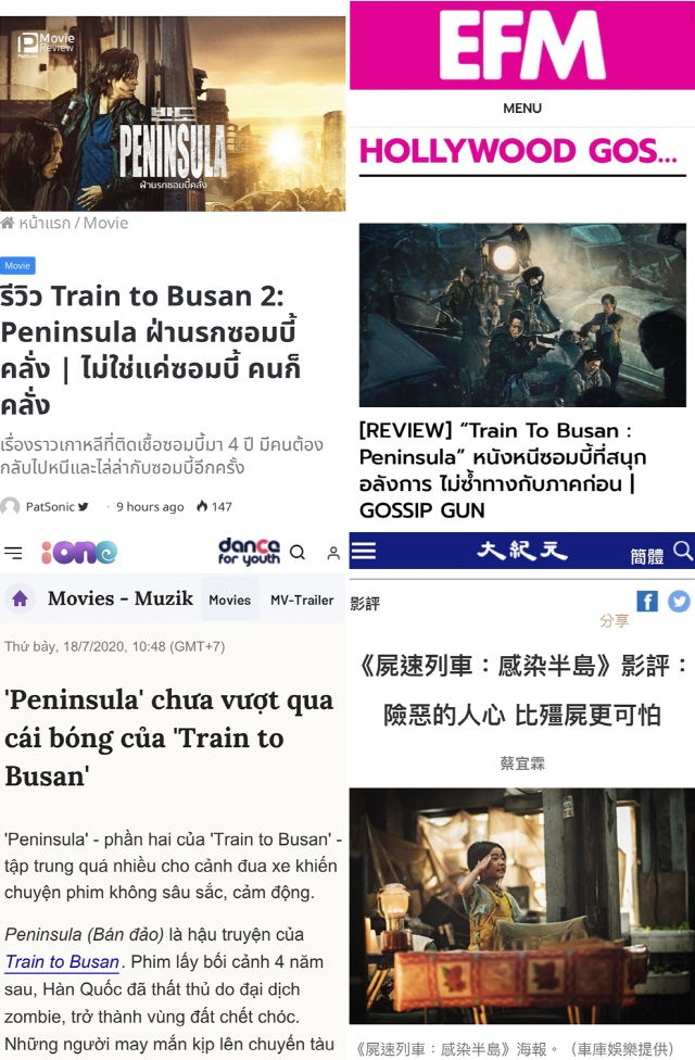 개봉 첫 주말 대한민국, 대만, 싱가포르, 말레이시아, 베트남 등 아시아 5개국 박스오피스 1위를 달성하며 2000만불 매출을 올린 '반도'가 기록적인 성과를 올리며 승승장구 중이다.