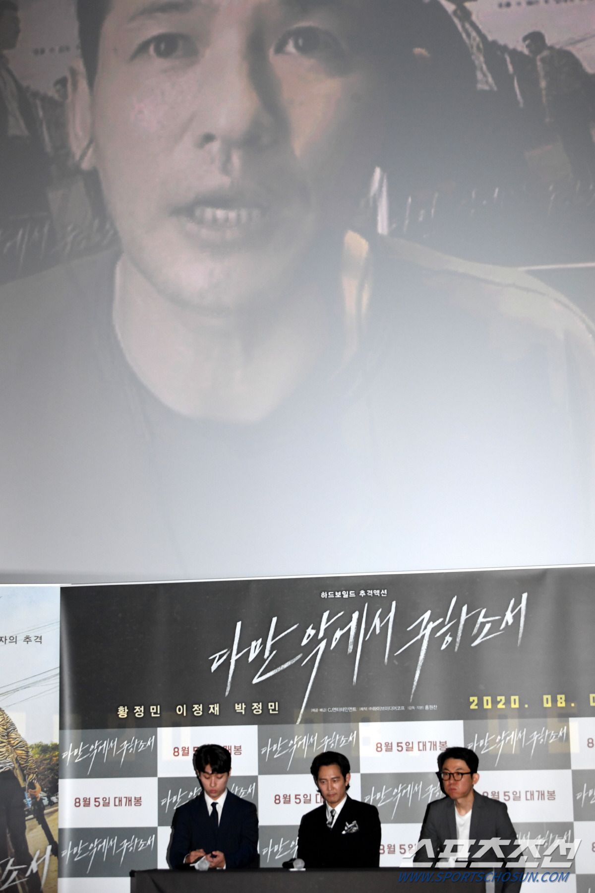 마지막 청부살인 미션 때문에 새로운 사건에 휘말리게 되는 남자와 그를 쫓는 무자비한 추격자의 처절한 추격과 사투를 그린 하드보일드 추격 액션 영화 '다만 악에서 구하소서'(홍원찬 감독, 하이브미디어코프 제작). 28일 오후 서울 용산구 이촌동 CGV 용산아이파크몰에서 열린 '다만 악에서 구하소서' 언론·배급 시사회를 통해 첫 공개 됐다. 이날 시사회에는 무자비한 추격자 레이 역의 이정재, 인남(황정민)의 마지막 미션을 돕는 조력자 유이 역의 박정민, 그리고 홍원찬 감독이 참석했다. 극 중 마지막 임무를 수행하는 처절한 암살자 인남 역의 황정민은 신작 '교섭'(임순례 감독) 촬영으로 지난 13일 요르단 로케이션 촬영을 떠나 '다만 악에서 구하소서' 간담회에 불참, 대신 화상 인터뷰를 통해 시사회 자리를 대신했다.