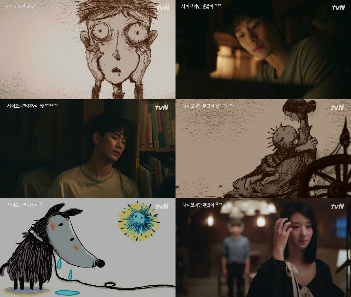 때문에 '사이코지만 괜찮아'에 등장하는 동화책 속 그림체들은 형형색색의 컬러로 화려하지 않고 모노톤의 거친 질감으로 표현돼 있어 동화책 스토리에 담긴 묵직한 메시지와 잘 어우러져 감정이입을 돕는다.