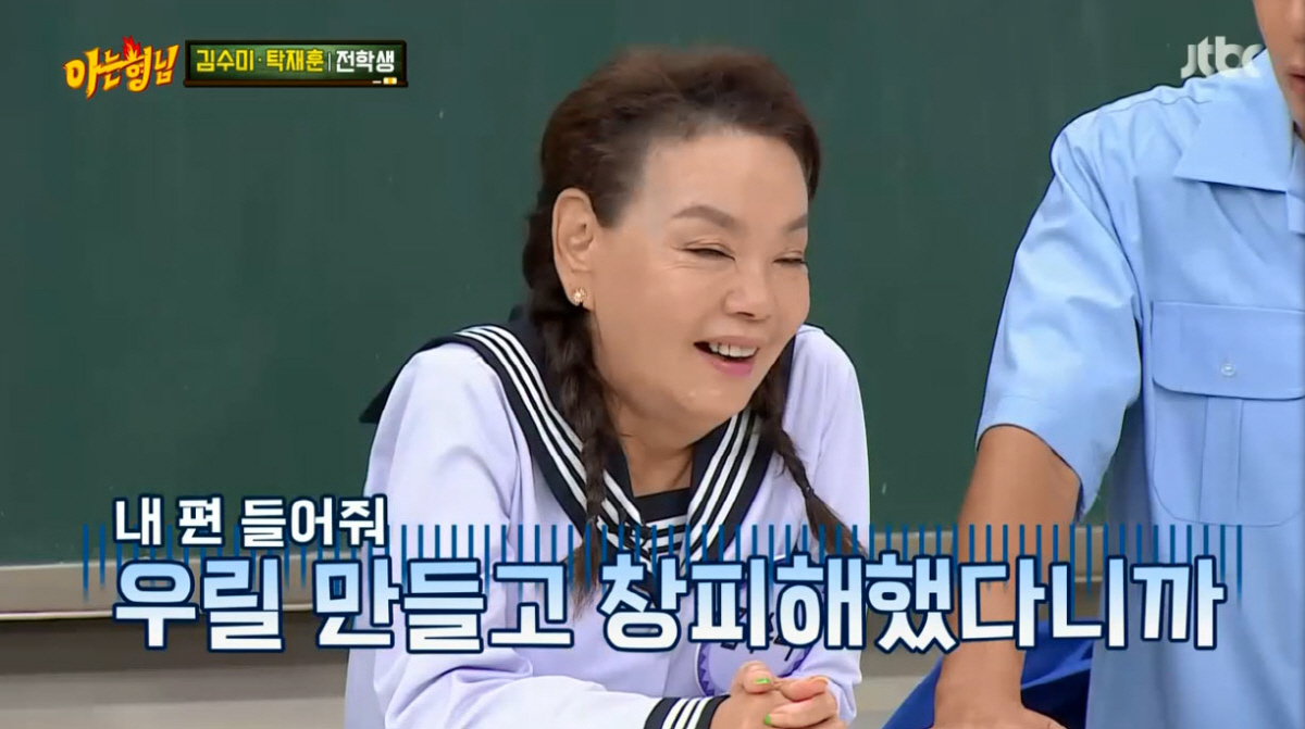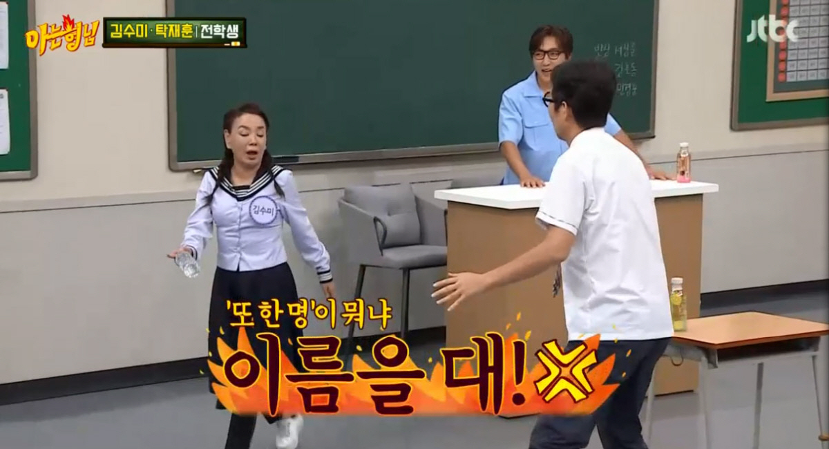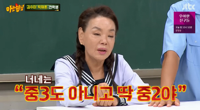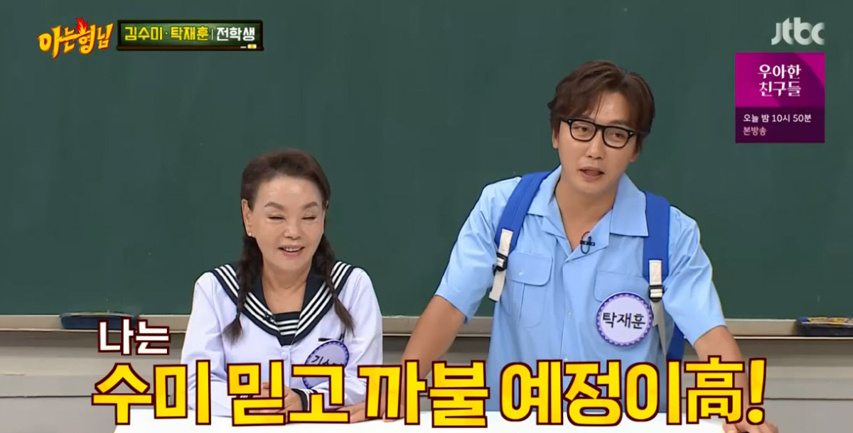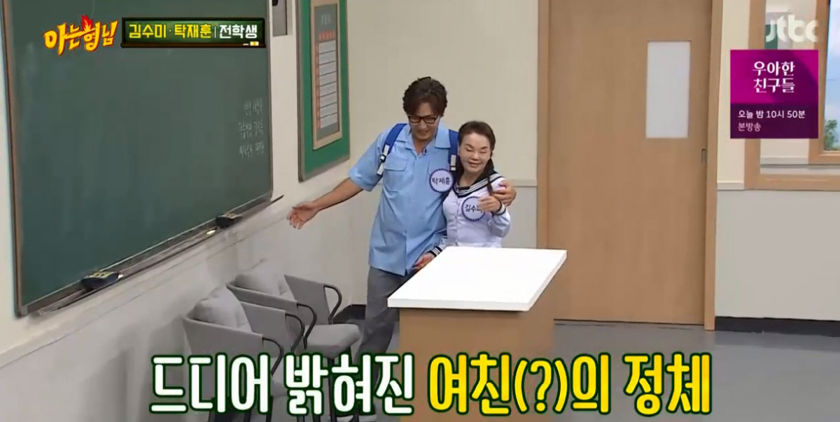 1일 방송한 JTBC '아는형님'에는 탁재훈이 먼저 교실에 들어와 "여사친이 왔다"며 "미야"를 불렀다. 교실 문을 열고 들어온 여사친은 양 갈래로 땋은 머리와 교복을 입은 중견배우 김수미. 김수미는 "생각보다 여리고에서 온 김수미", 탁재훈은 "수미 믿고 까불 예정이고"에서 왔다고 소개했다.