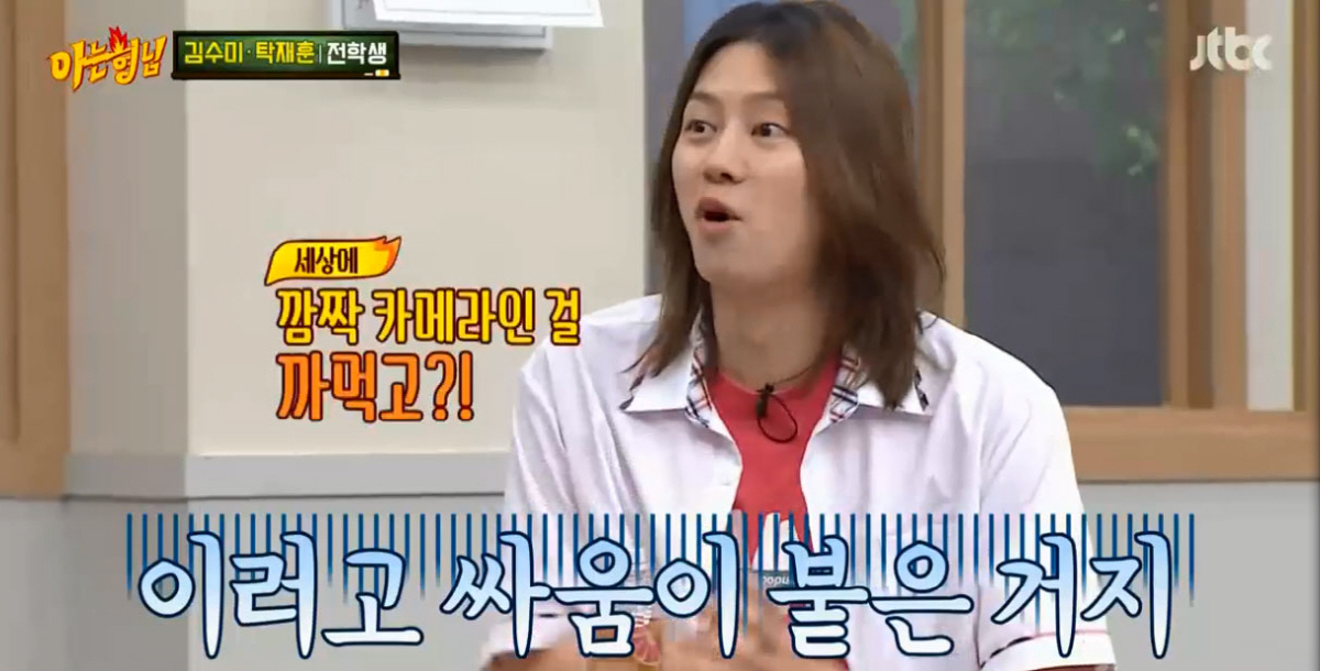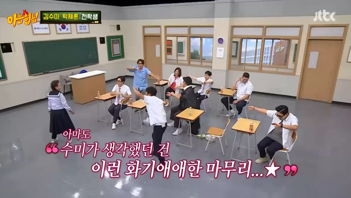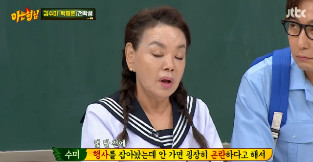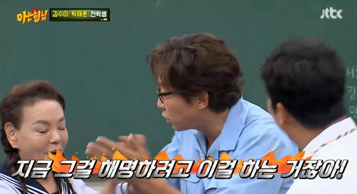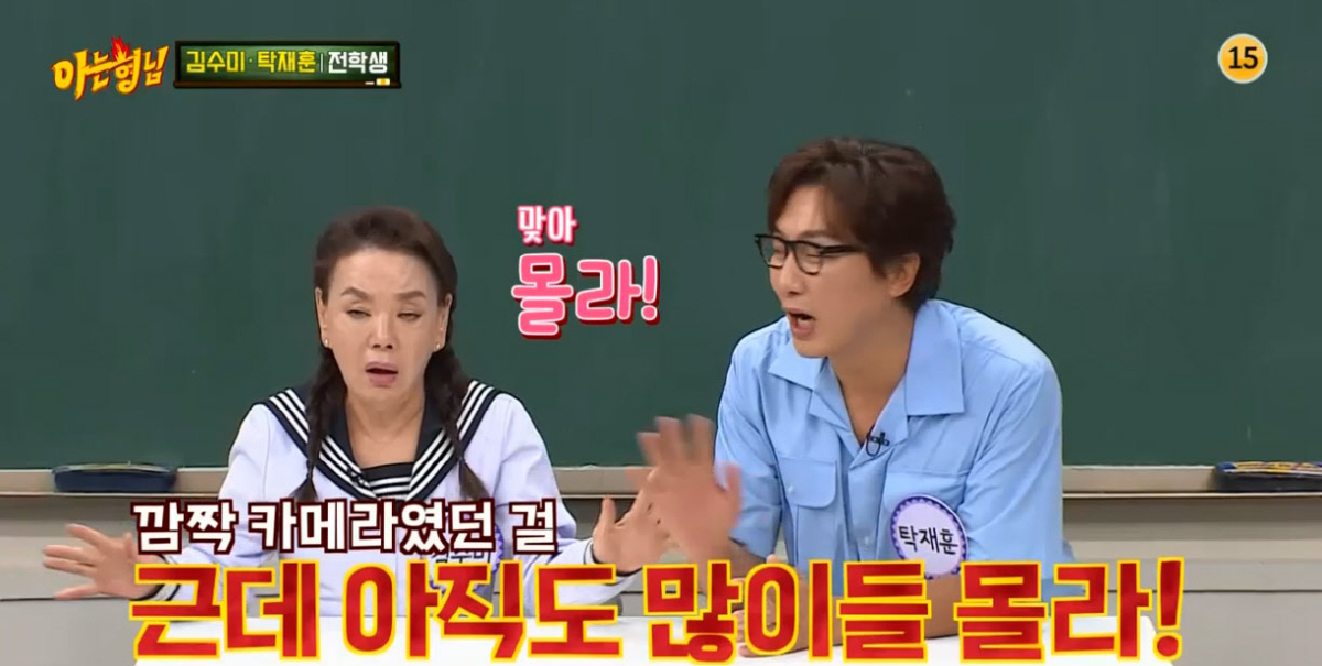 1일 방송한 JTBC '아는형님'에는 탁재훈이 먼저 교실에 들어와 "여사친이 왔다"며 "미야"를 불렀다. 교실 문을 열고 들어온 여사친은 양 갈래로 땋은 머리와 교복을 입은 중견배우 김수미. 김수미는 "생각보다 여리고에서 온 김수미", 탁재훈은 "수미 믿고 까불 예정이고"에서 왔다고 소개했다.