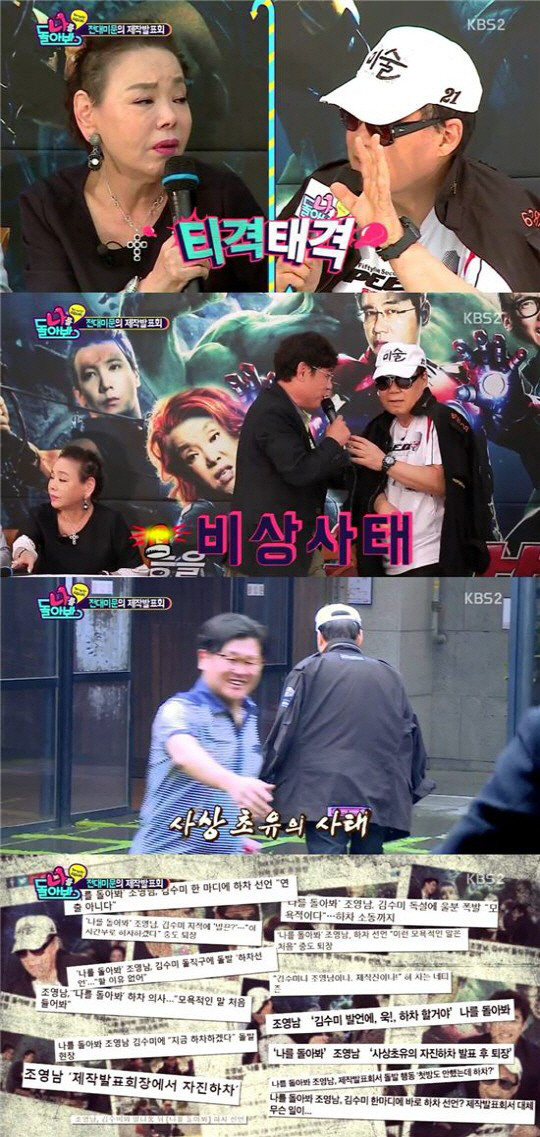 2015년 당시 제작발표회에서 조영남이 "우리팀 시청률이 가장 낮게 나오면 이경규와 함께 자진 사퇴하겠다"고 돌발적인 발언을 했다. 이에 박명수와 짝을 이룬 김수미는 "조영남, 이경규 팀이 분당 시청률이 낮다고 하더라"고 분발을 촉구했는데 이를 들은 조영남이 "이렇게 모욕적인 말은 처음 들어본다. 수미씨 얘기를 들으면 내가 사퇴해야할 것 같다. 분당 시청률이 가장 형편없다고 하지 않냐. 프로그램에서 빠지겠다"며 자리를 박차고 나갔다. 이경규와 진행을 맡은 조우종 아나운서, 담당 PD들이 그를 막아섰지만 소용없었고, 김수미는 나가는 조영남의 등을 향해 "그래요. 빠지세요"라고 소리쳤다.