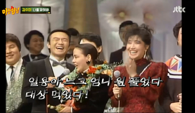 김수미는 "전원일기를 22년 했는데 10년 하다보니까 박은수 선배가 진짜 아들로 보이더라. 회식하다가 '먹어 아들' 이렇게 하더라. 박은수 선배도 '어 엄마' 이렇게 받더라"라고 말해 웃음을 유발했다. 김수미는 일용 엄니로 연기대상까지 받았고 수상 소감으로 "일용아 느그 엄니 원풀었다. 대상 먹었다"고 말해 현장을 폭소로 물들였다.