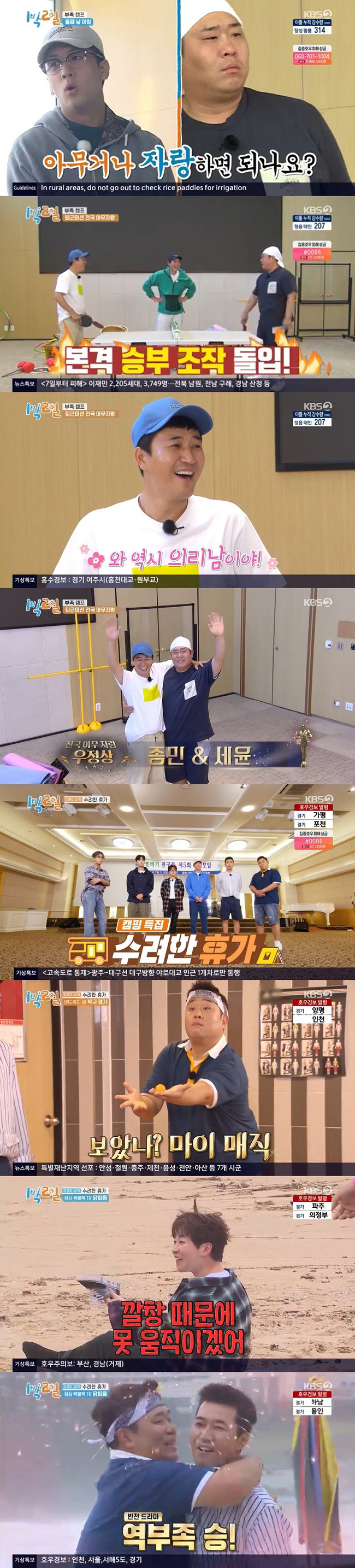 뿐만 아니라 생애 첫 닭싸움 도전임에도 불구하고 최강자 문세윤을 쓰러뜨린 연정훈, 도망만 치다가 허무하게 패배하며 폭풍 웃음을 안긴 딘딘과 라비 등 예측을 불허하는 승부 결과와 반전이 이어져 눈길을 사로잡았다. 이렇듯 '1박 2일'은 온몸을 내던지는 멤버들의 활약으로 일요일 밤 안방극장의 웃음 버튼을 눌렀다.